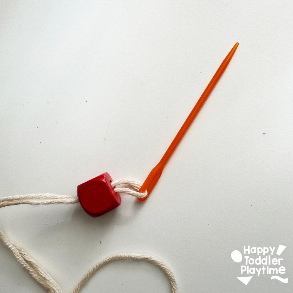 Cut a piece of yarn or string long enough for the necklace, and thread it through the hole in your pendant. Tie a knot at the top to secure it. Then, add beads to the string on both sides of the pendant for a decorative touch. Use an embroidery needle to thread the beads. Once complete, tie the ends together and trim the ends so they look clean!