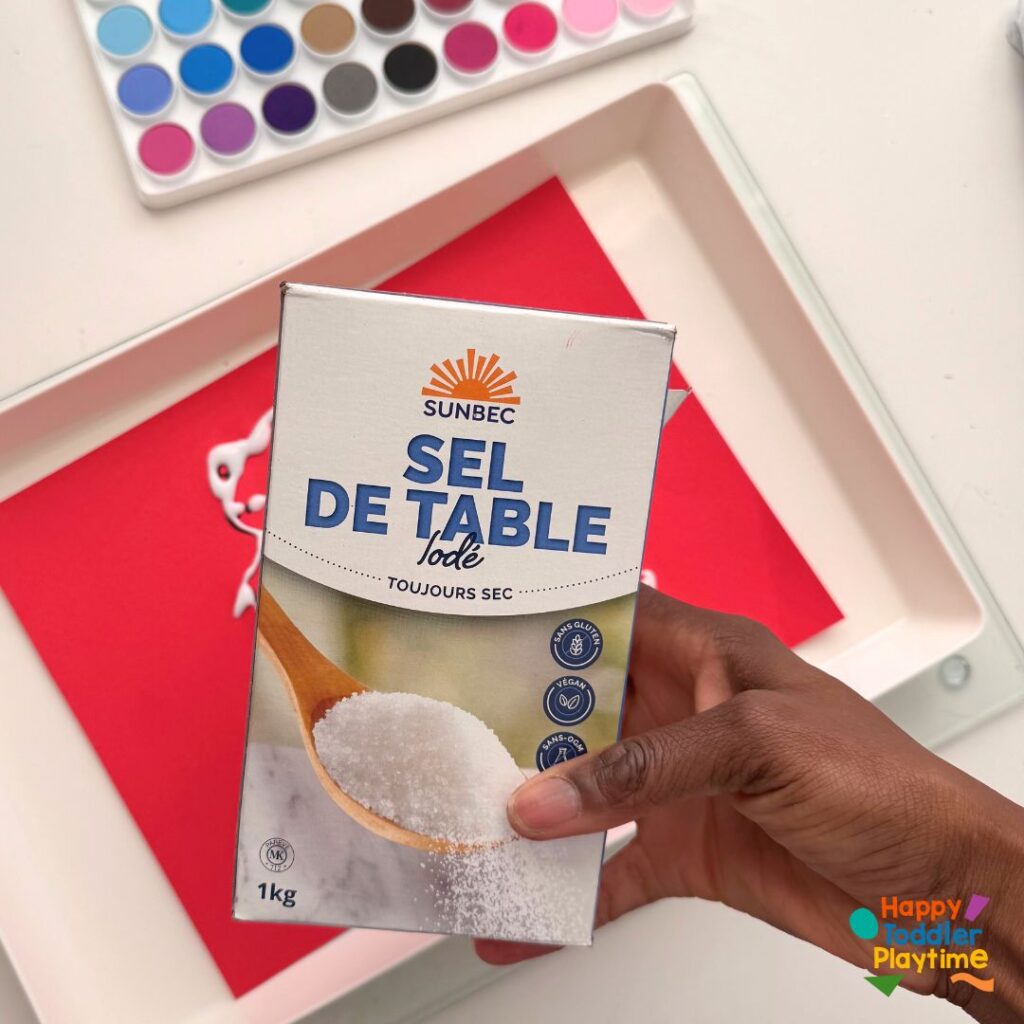 Lay the red paper on the tray to prevent the glue and salt from spilling over. If you’re doing this with younger children, this is a great moment to discuss the significance of red in Chinese culture, symbolizing good fortune and joy.