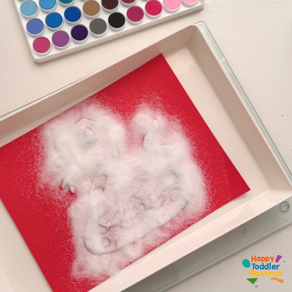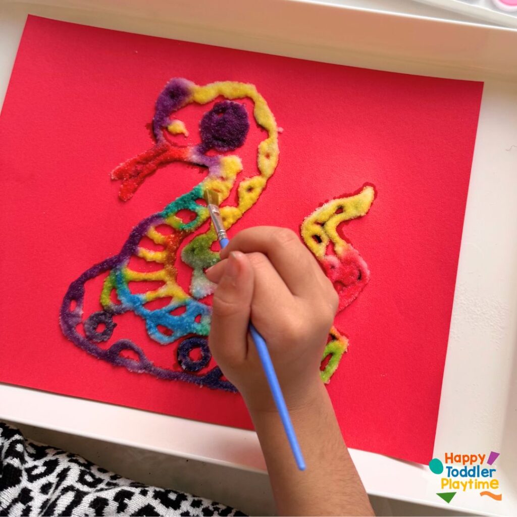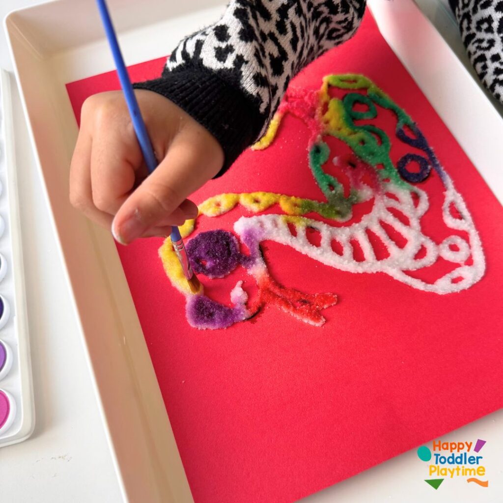 Once your glue and salt outline is set, dip your paintbrush in water and then gently into the watercolors. Lightly touch the salt-covered glue lines with the paintbrush. Watch as the color spreads magically across the salty trails. This is a delightful sensory experience, especially for kids, as they see the paint travel in unpredictable patterns.