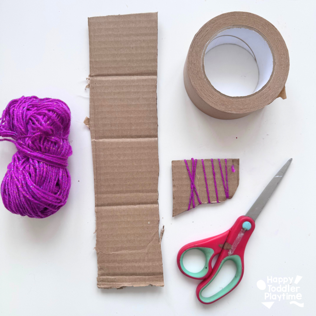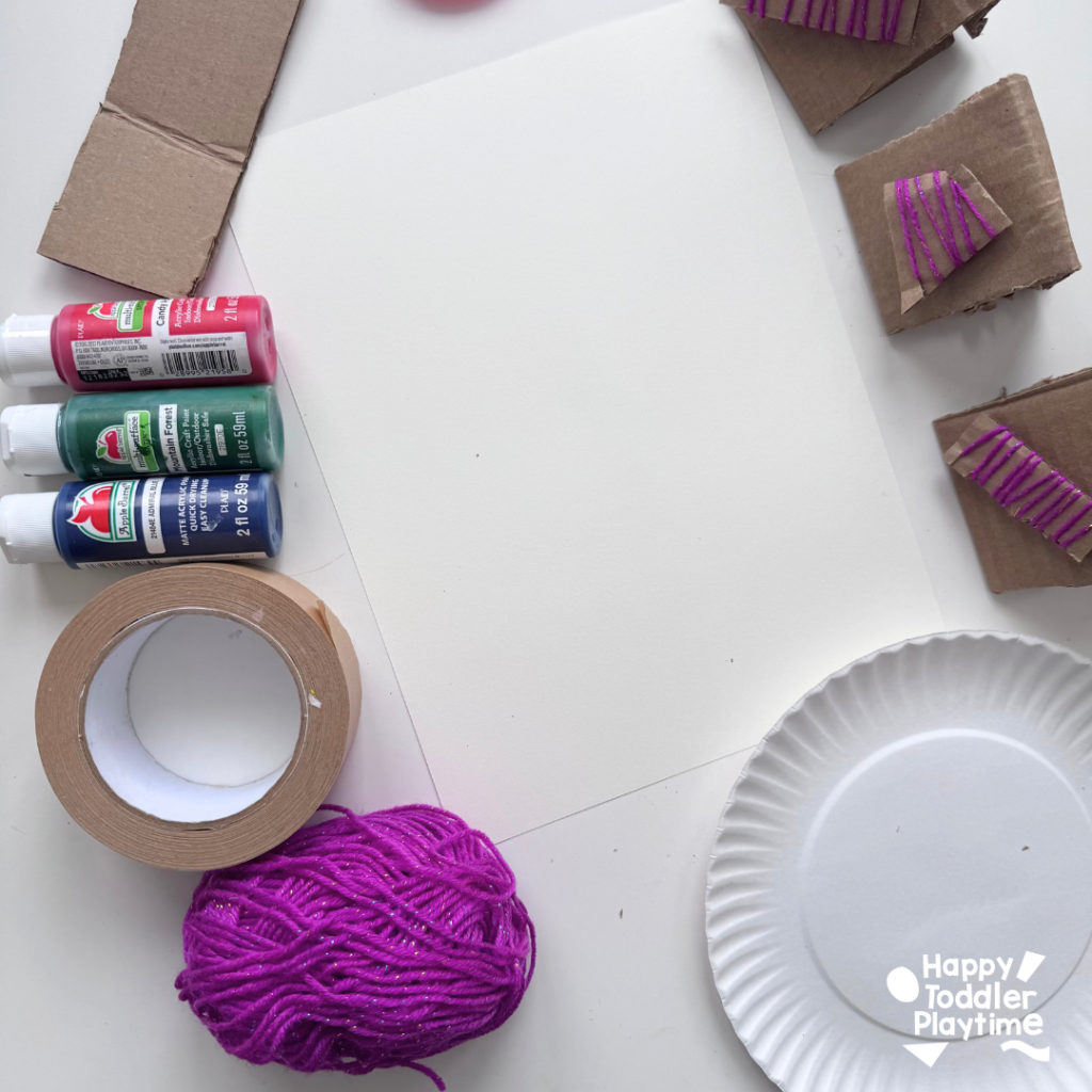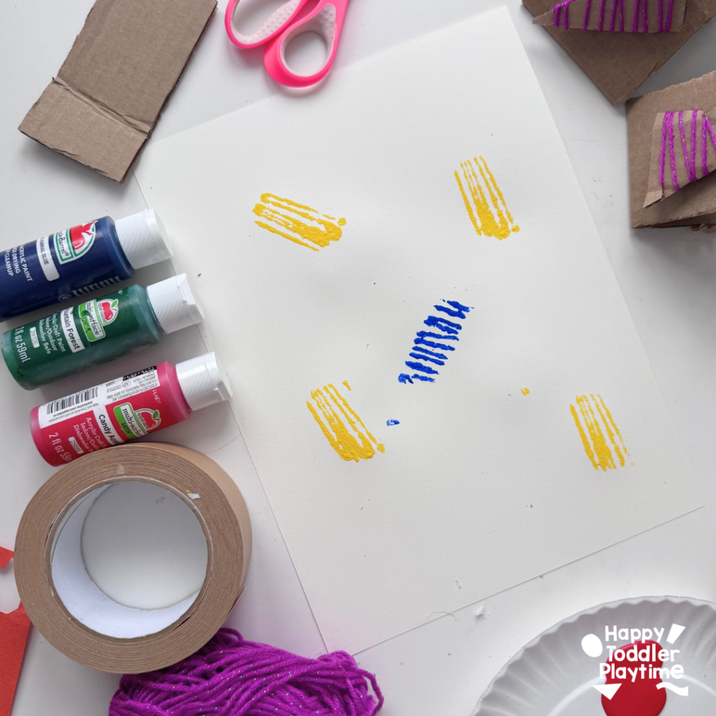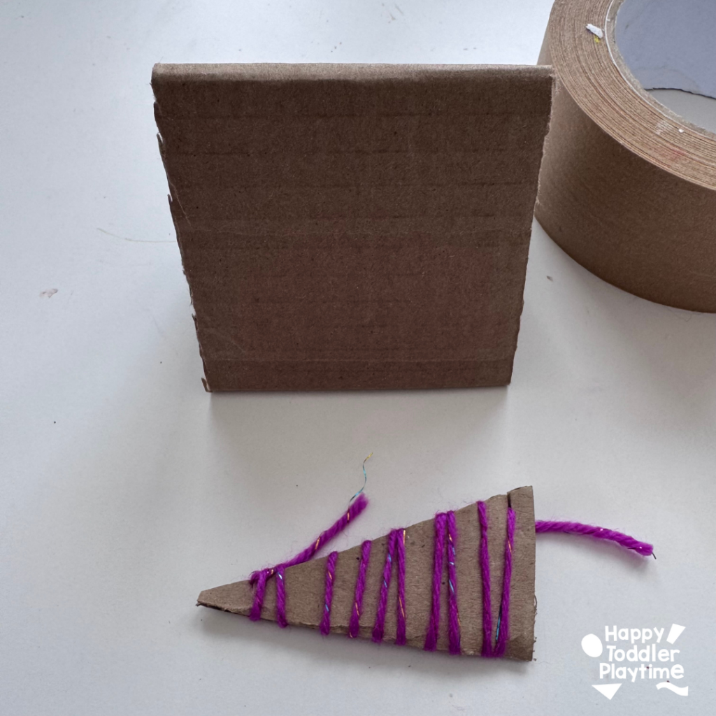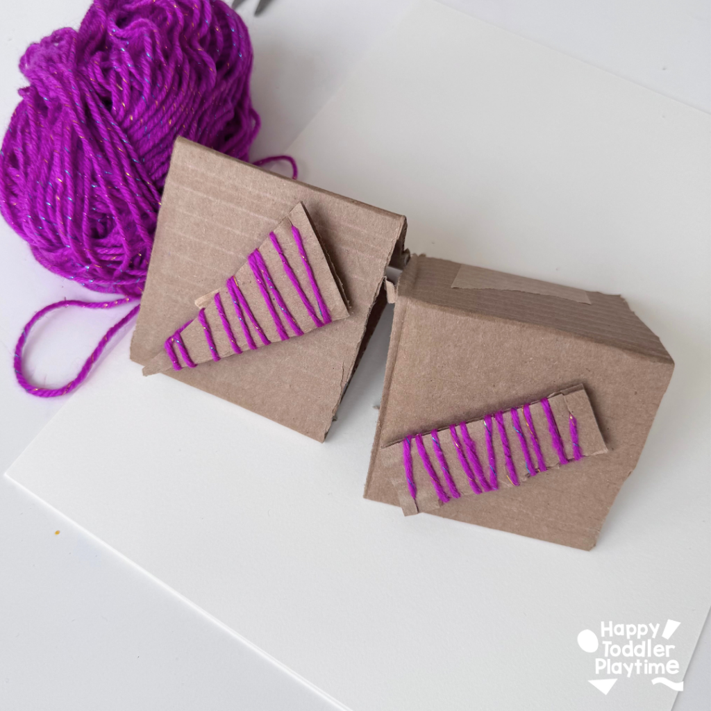 - Either tape or glue the cardboard shape wrapped in yarn on the base of your cardboard tent. Make sure it’s secure so that it doesnt come off while stamping and painting. Create between 3 and 4 different shaped stamps using this method.