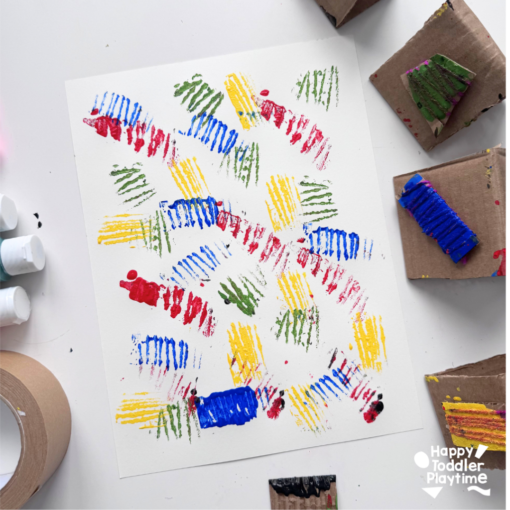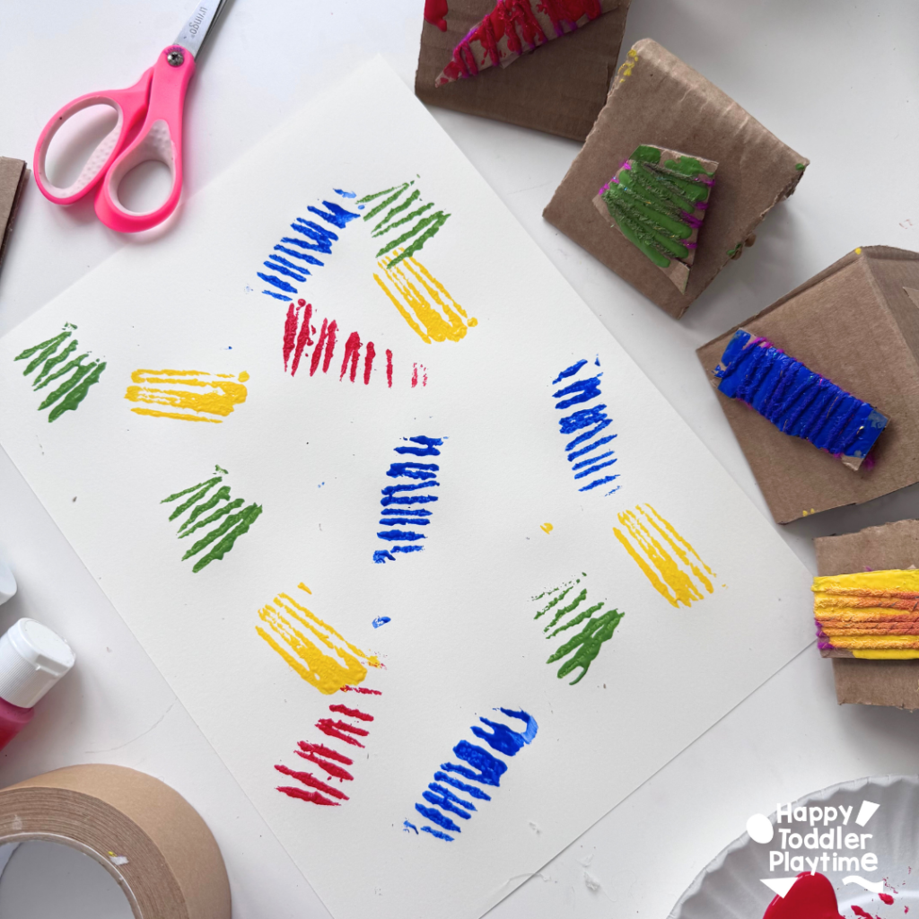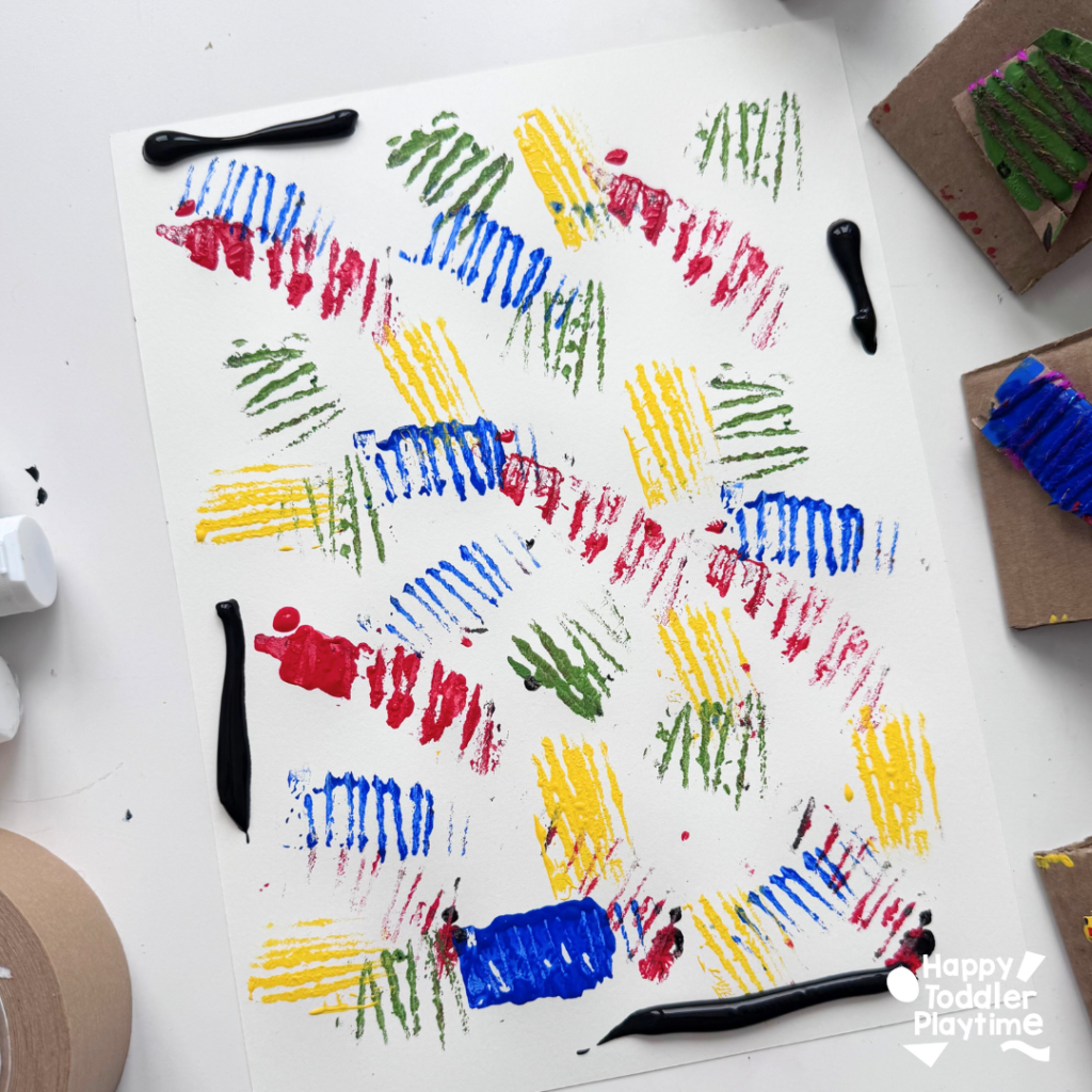 - Carefully dip your cardboard stamp into one color and then stamp it a few times on the scrap piece of paper to remove the excess paint. You want your stamp to only reveal the paint on the lines. So stamp your stamp on a scrap piece of paper until you get that effect. Then begin to stamp it on your cardstock. There is no wrong way to stamp here! Make sure to use all the colors. Feel free to over lap colors but be careful of mixing colors too much.