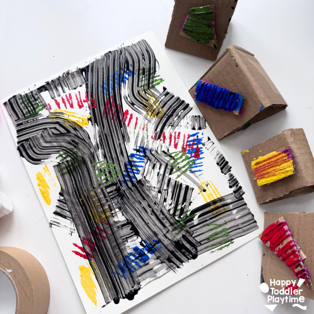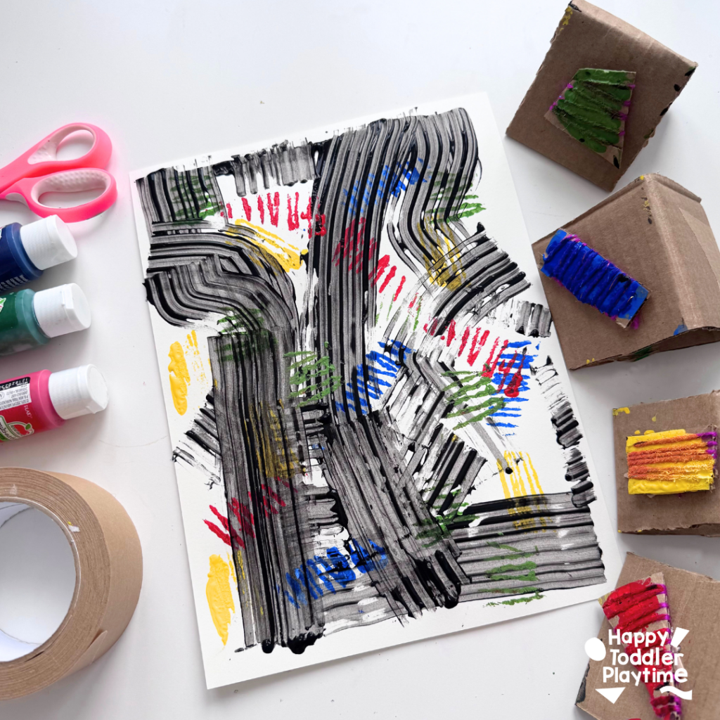 - Pour out black paint at different part of your page. Take your cardboard scraper and move the black paint over around the page in one fluid motion. Continue making long or short movements and in different directions. Try not to cover the entire page with black scrapes. Leave some part white or just with the colored prints for contrast.