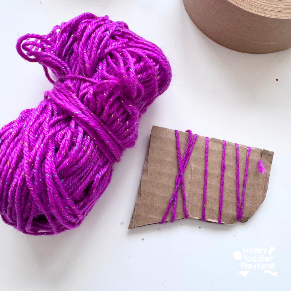 - With your small cardboard shape, cut a slit on either side of the shape. Place the end of yarn in the first slit and start to wrap the yarn around the shape until you reach the end. Cut the end and place the end in the last slit.