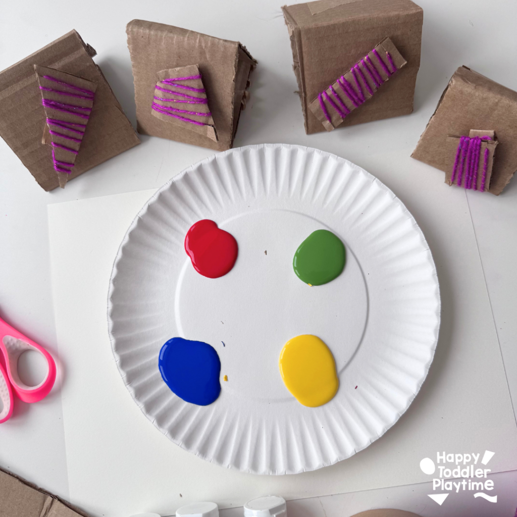 - Grab a sheet of cardstock and another scrap piece of paper. Also pour the red, green, blue and yellow paint on top a paper plate.