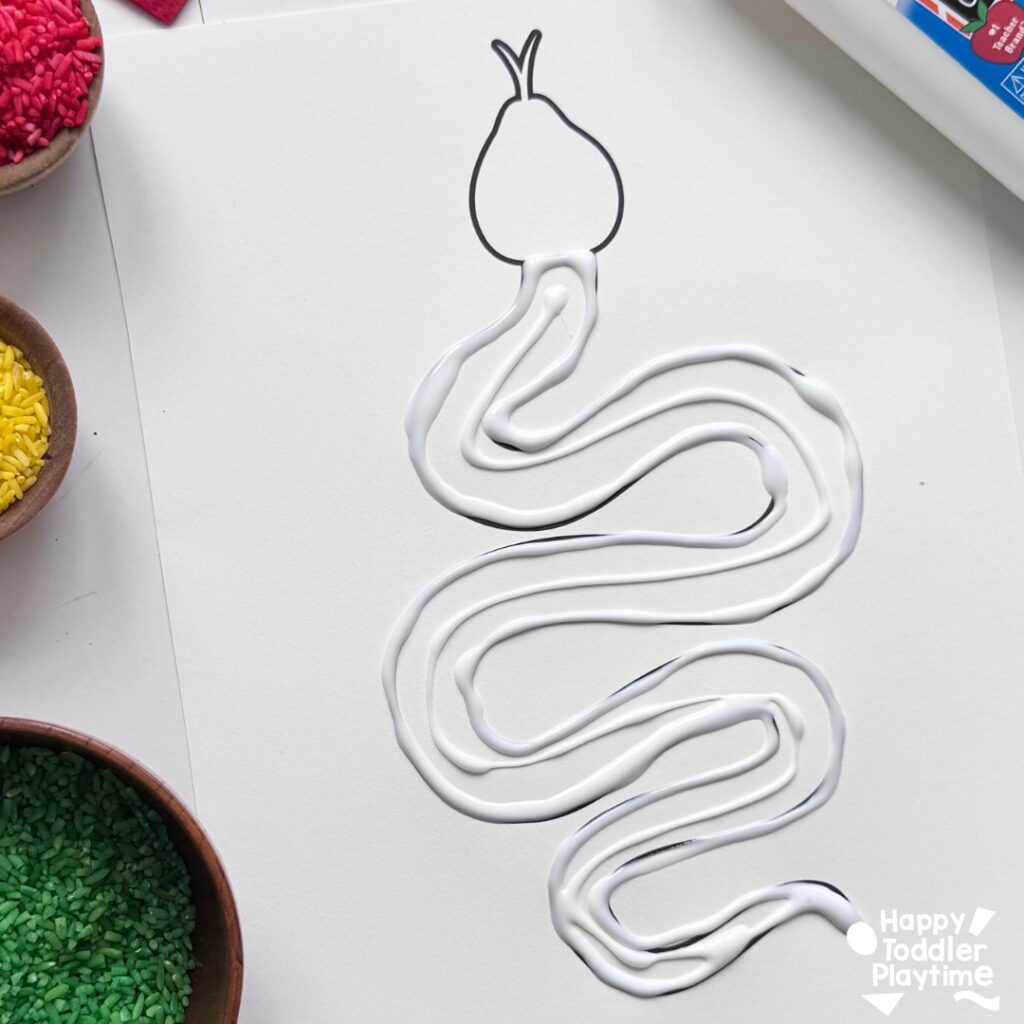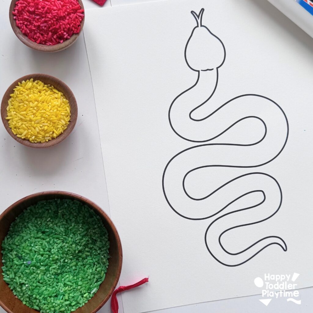 - Use a paintbrush or glue bottle to spread glue inside the snake outline. Kids can choose to fill in sections or cover the whole snake with colorful rice.