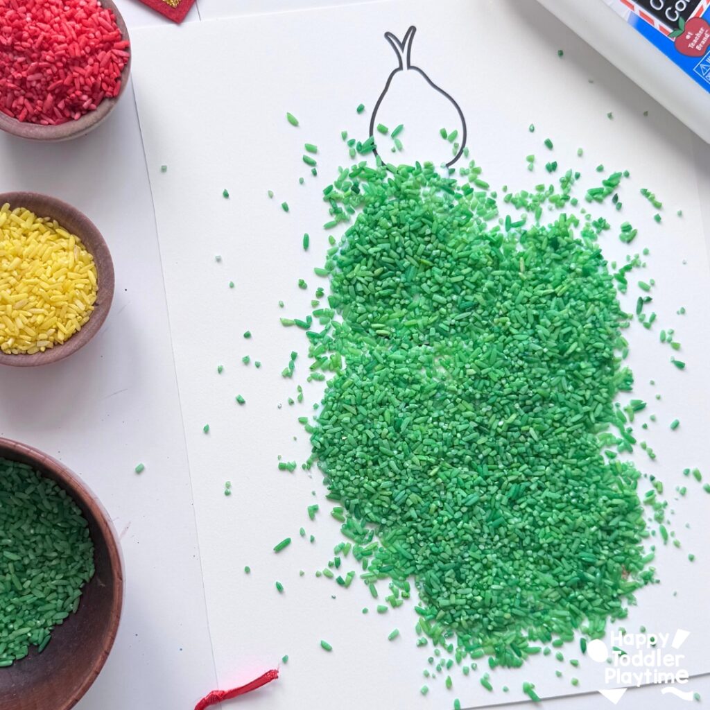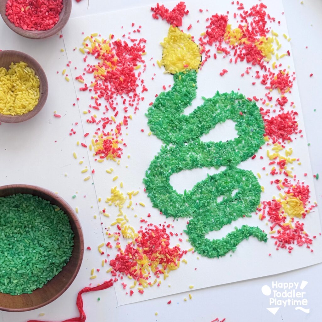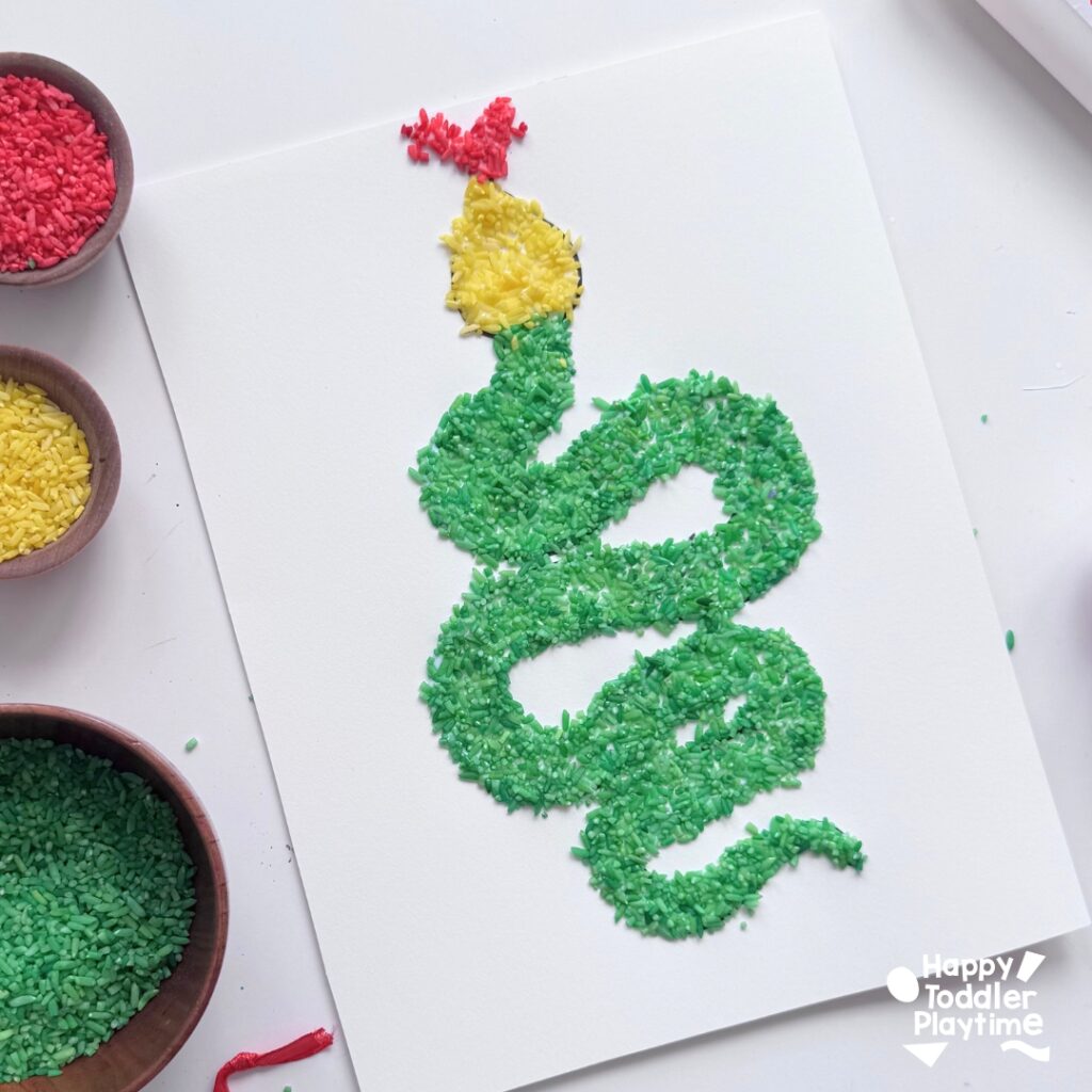 With just a simple snake outline, some colorful dyed rice, and glue, kids can create a vibrant, textured masterpiece that looks and feels amazing. Plus, it’s a fantastic fine motor activity—sprinkling, pouring, and pressing rice onto the paper helps develop hand strength and coordination while giving kids a fun, hands-on way to express themselves.