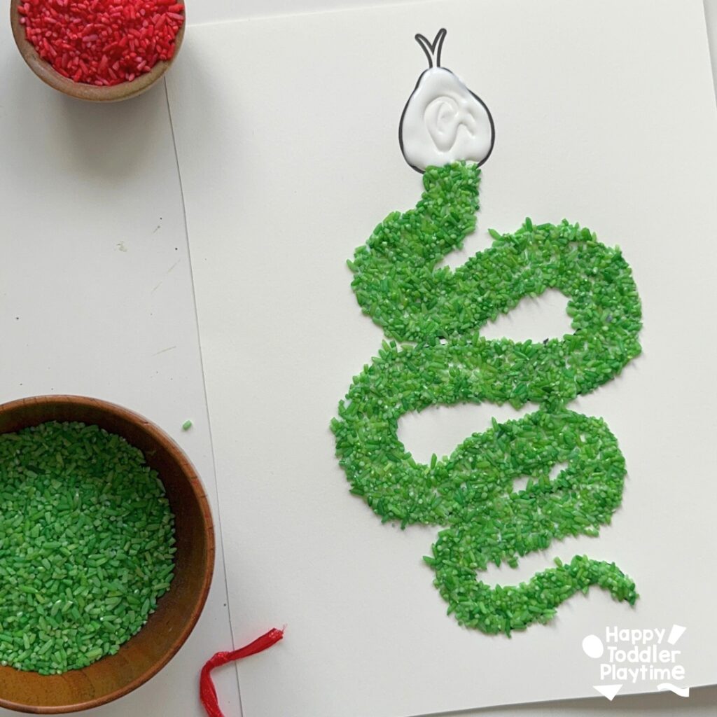 - Time for the fun part! Sprinkle the colored rice onto the glue, pressing it down slightly so it sticks. Shake off the excess rice and let the snake dry completely.