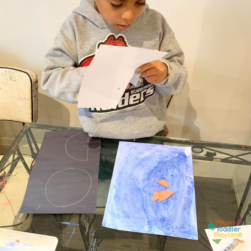 - From the black construction paper, draw and cut out a medium circle for the penguin’s head and a large semi circle for a wing.