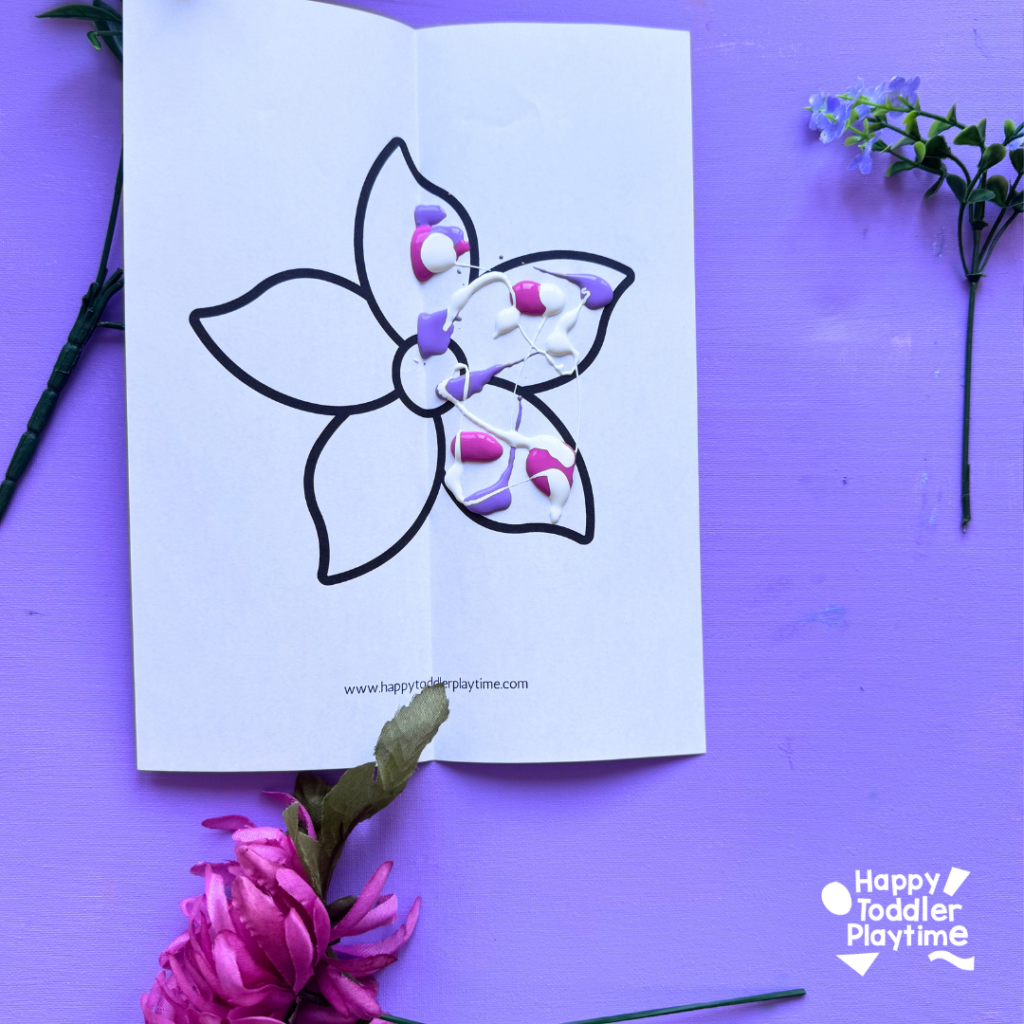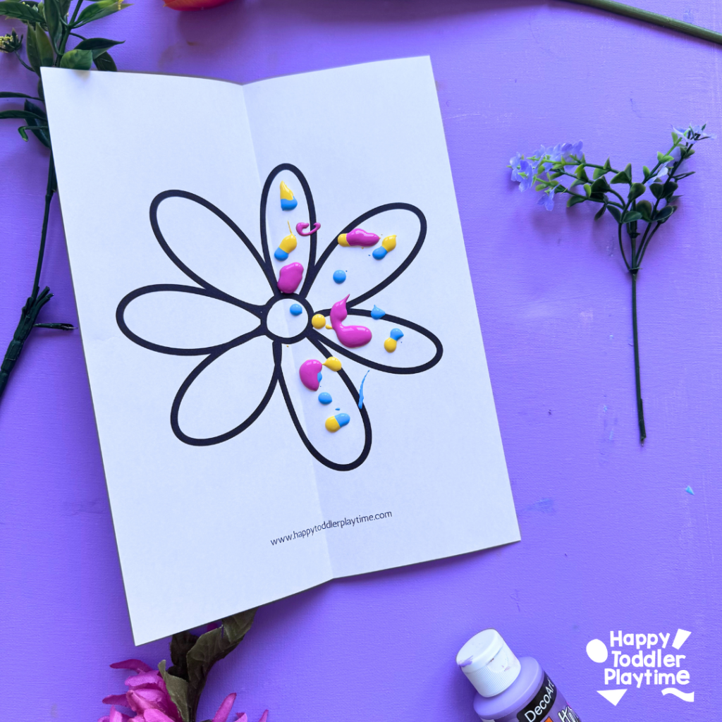 Fold the paper with the flowers in half. Squeeze small drops or lines of paint onto half of your paper. You don’t need much—just a few dabs of each color will do! Kids can try stripes, circles, or random blobs. No wrong way here.