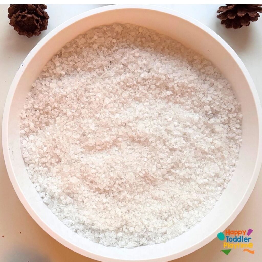 Pour rock salt into a large sensory bin or shallow container. Spread it out evenly to create a snowy base. This will give the trucks a realistic surface to “drive” on.