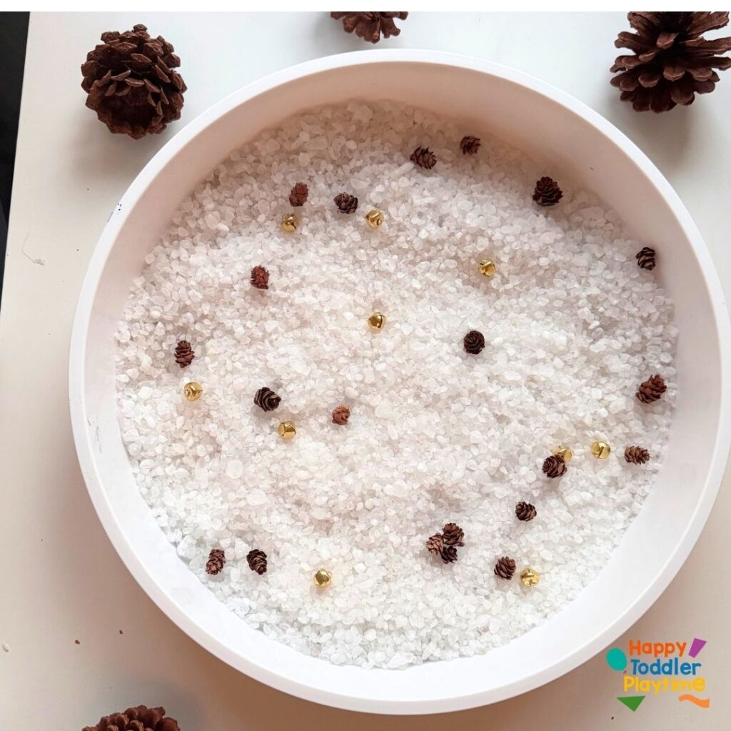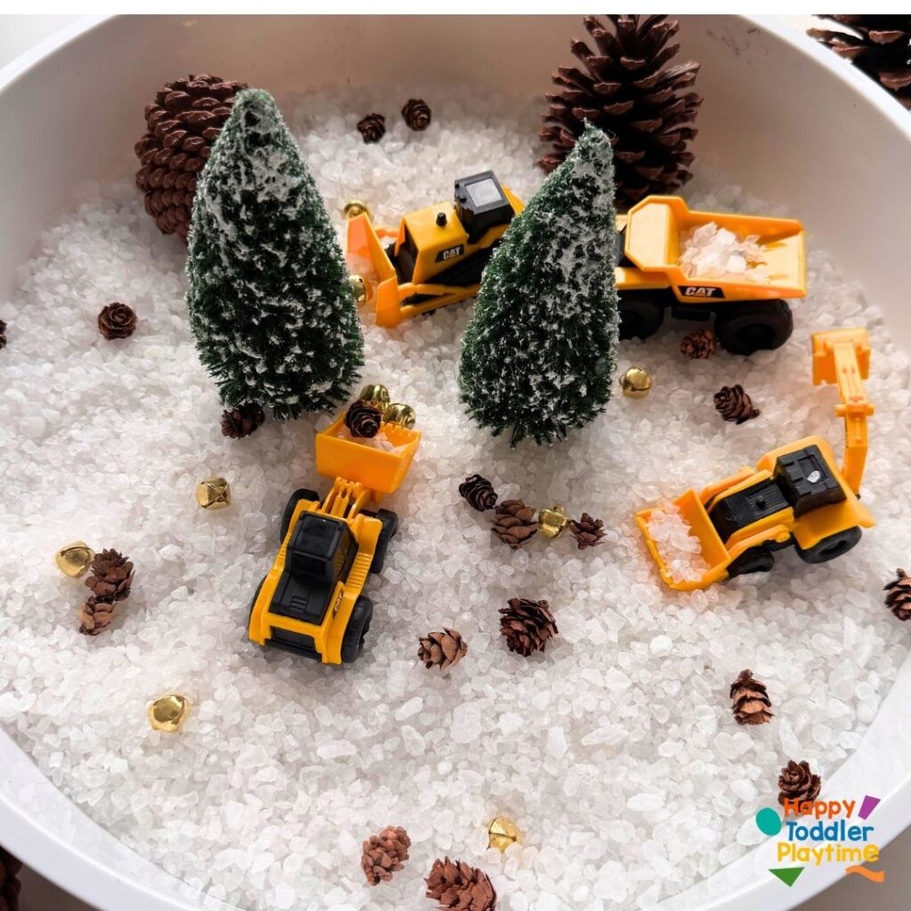 This sensory bin brings together everything kids love about winter and vehicles in one engaging activity. The rock salt “snow” is fun to scoop and push around, while the trucks, pine cones, and trees inspire endless pretend play. It’s a great way to keep kids busy and entertained during the holiday season.
