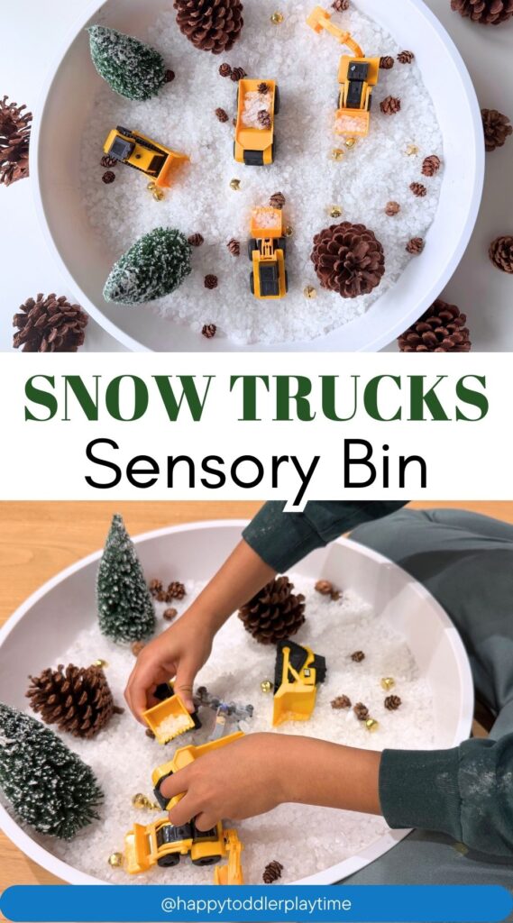Snow and trucks—two things kids absolutely love! Combine them in a sensory bin, and you’ve got a recipe for hours of imaginative play. When I introduced this Snow Trucks Sensory Bin to my kids, they were immediately drawn to the texture of the “snow” (rock salt) and couldn’t wait to start scooping, hauling, and stacking with their toy trucks. The addition of pine cones, bottle brush trees, and jingle bells made it feel like a little winter wonderland right in our living room.