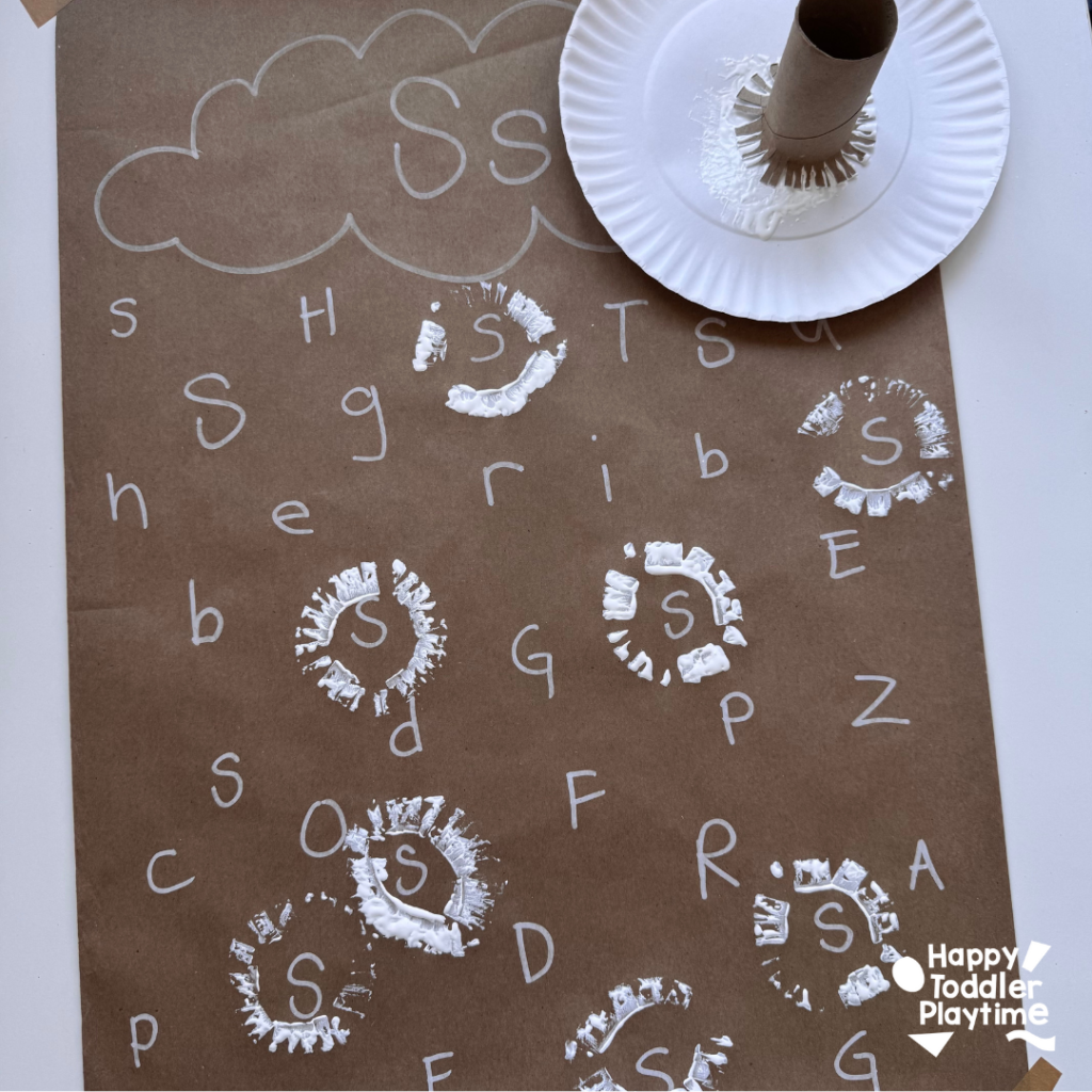 - Start the letter hunt. Dip the snowflake tube into the paint, then scan the paper to find the letter S or s.