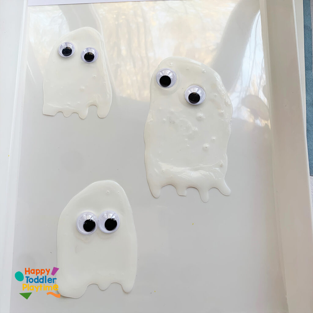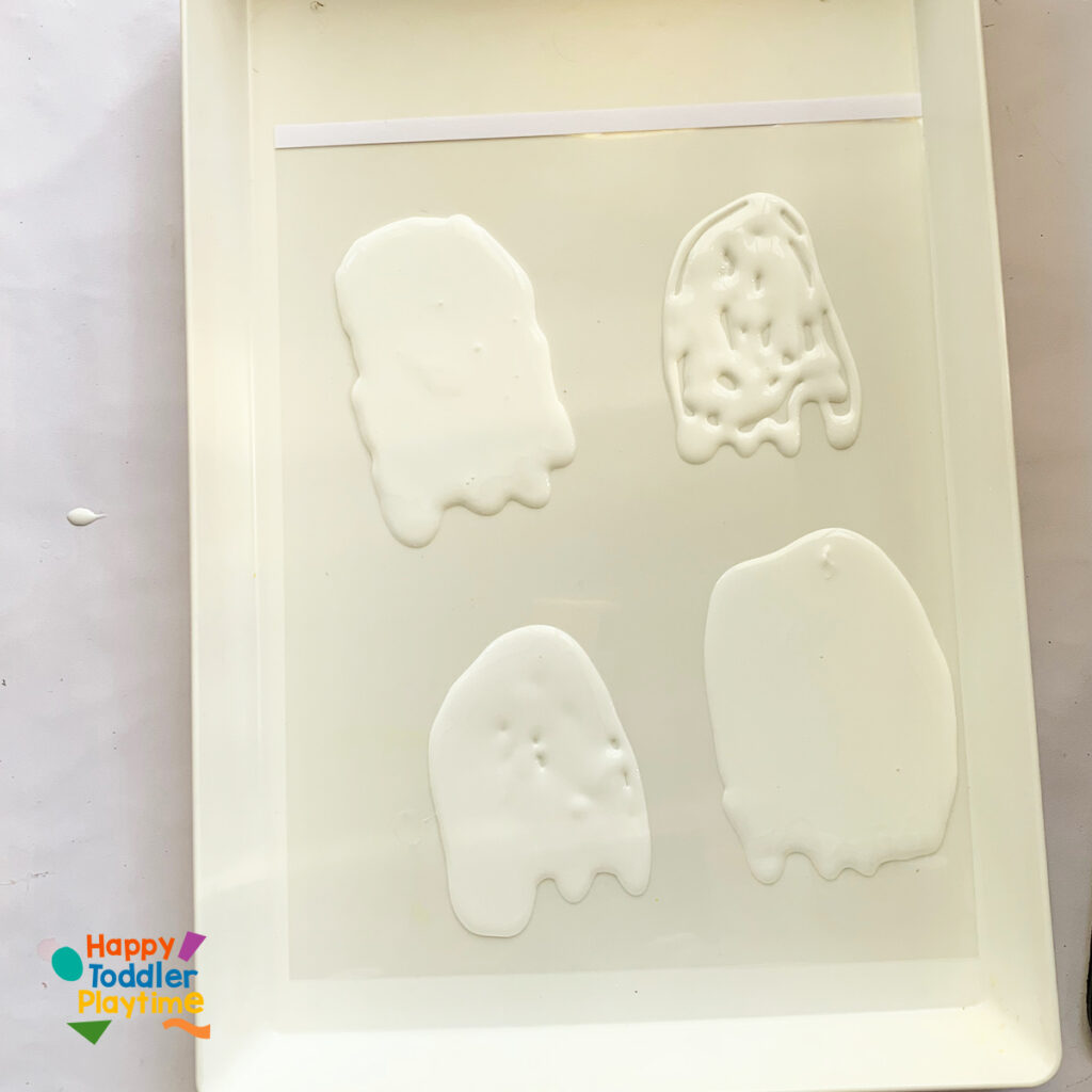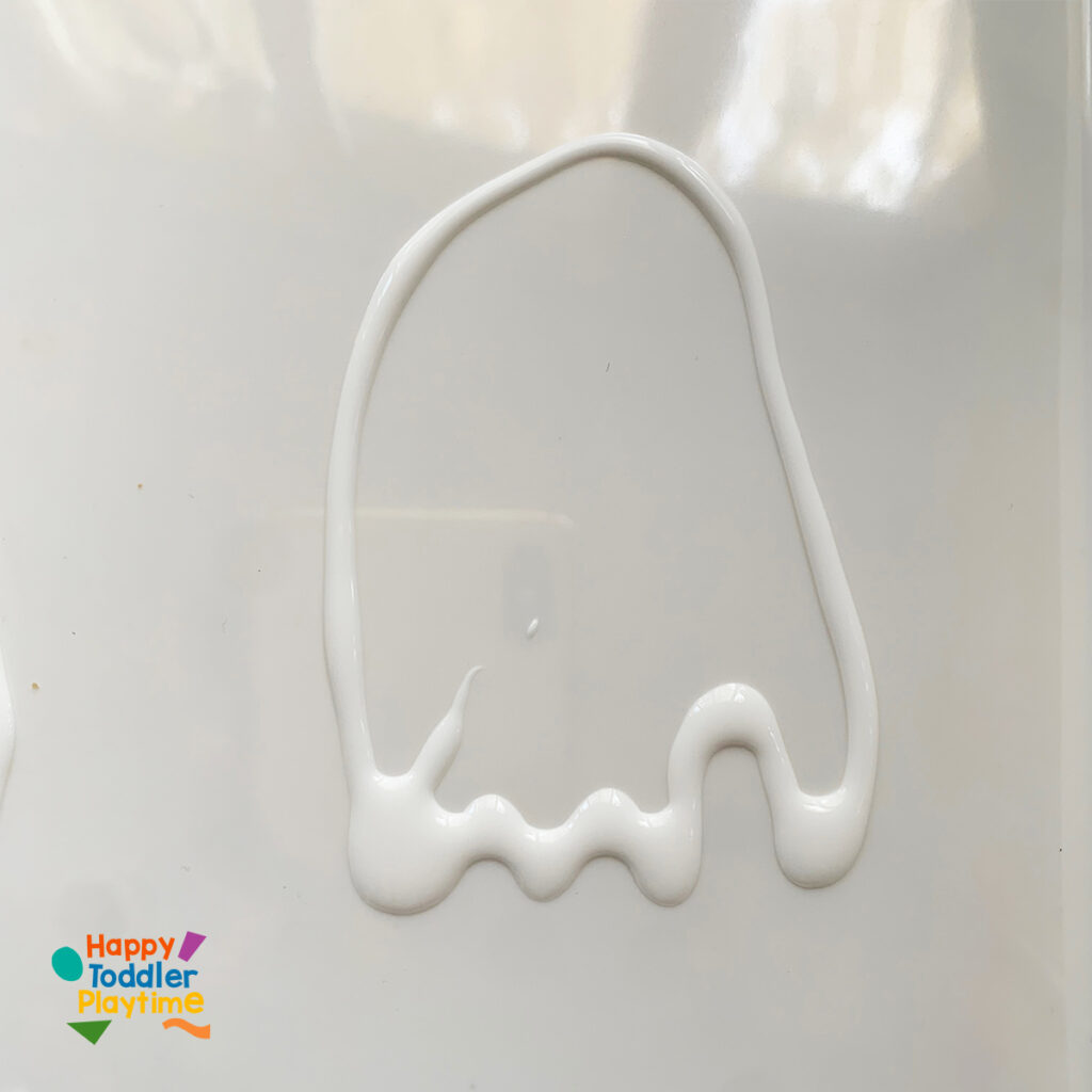 Using white glue, let your child squeeze out the shape of a ghost directly onto the plastic sheet protector. Encourage them to make different ghost shapes—tall, short, wavy, or round! Start by creating the outline of the ghost and fill it in with the glue.