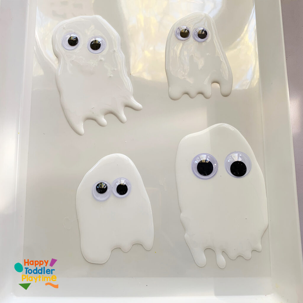 While the glue is still wet, place googly eyes onto each ghost design. You can use different sizes to give each ghost its own personality. Feel free to add more eyes for a fun twist!
