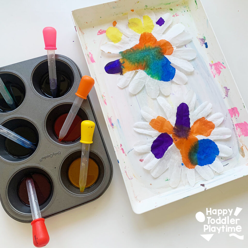 This classic process art craft is all about color blending and fine motor fun. Kids paint or drop watercolors on coffee filters and watch the colors bleed and mix to create dreamy, one-of-a-kind petals.