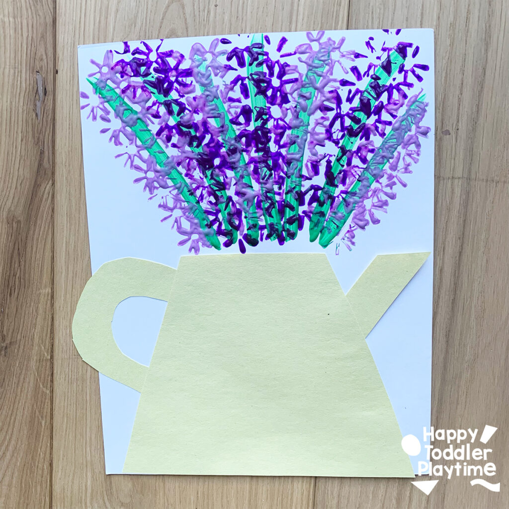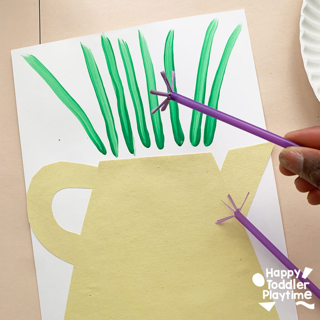 - Paint the Flowers: Dip the prepared straws into the purple (or lilac) paint, then stamp the flowers along the green stems. You’ll see the beautiful star-shaped flowers come to life.