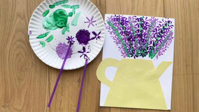- Prepare the Paints: Pour green and purple paint onto a paper plate. If you want to create lilac flowers, mix white paint with purple to get the desired shade.