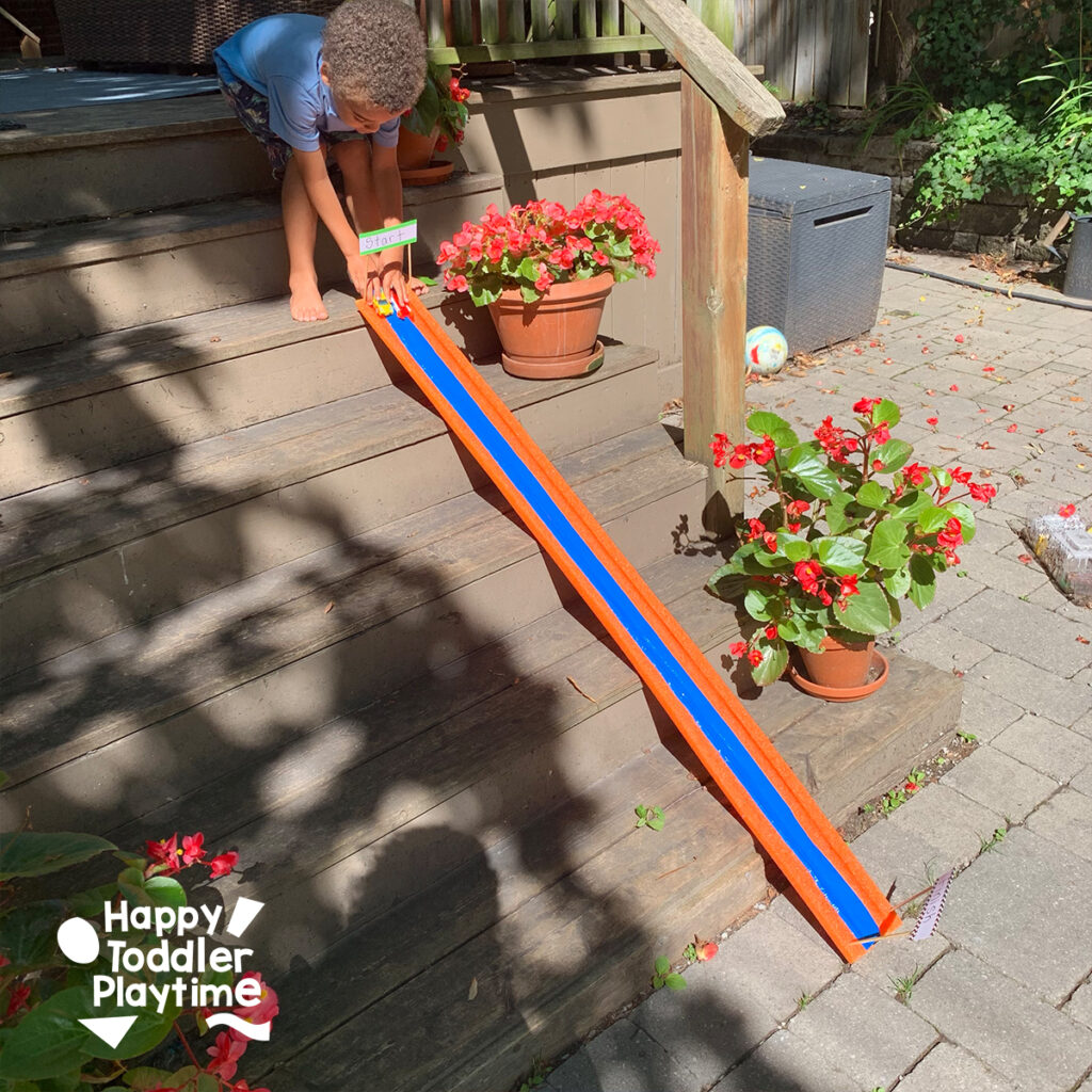 Need a fun idea to keep your kids busy this summer? Make a pool noodle racetrack and let the games begin! This is a fun gross motor activity that your car fan will love!