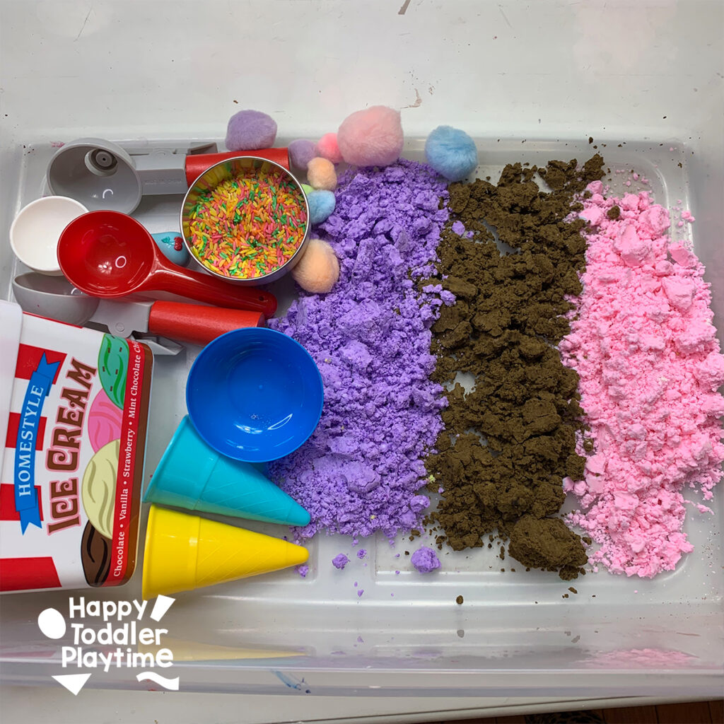 Create this super fun and engaging Fizzy Ice Cream Shop Sensory Bin for your kids this summer (or anytime of year) using common household ingredients! This is an easy STEAM activity for toddlers, preschoolers and even older kids!