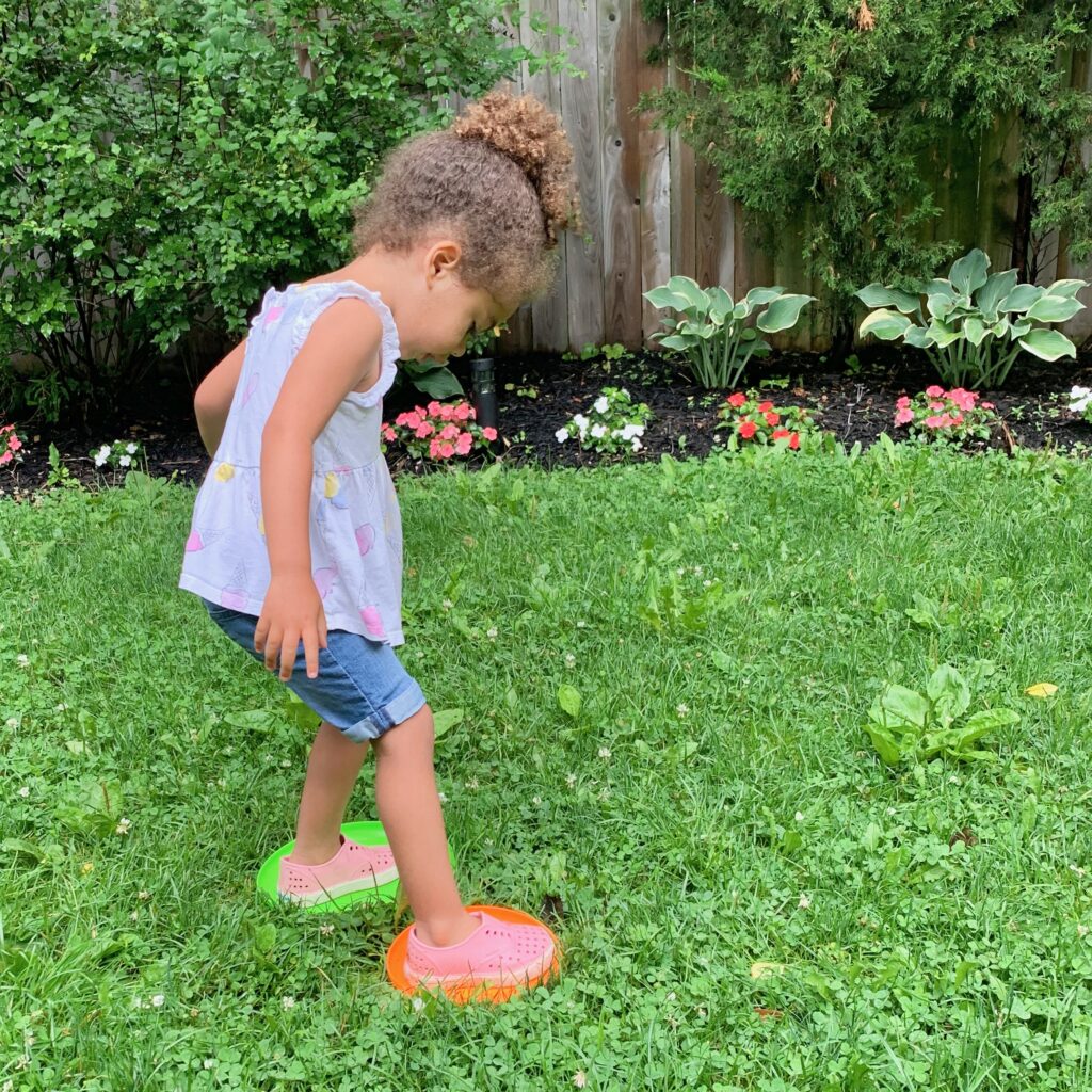 Grab two frisbees and use them a skates on grass for a fun and easy gross motor activity!