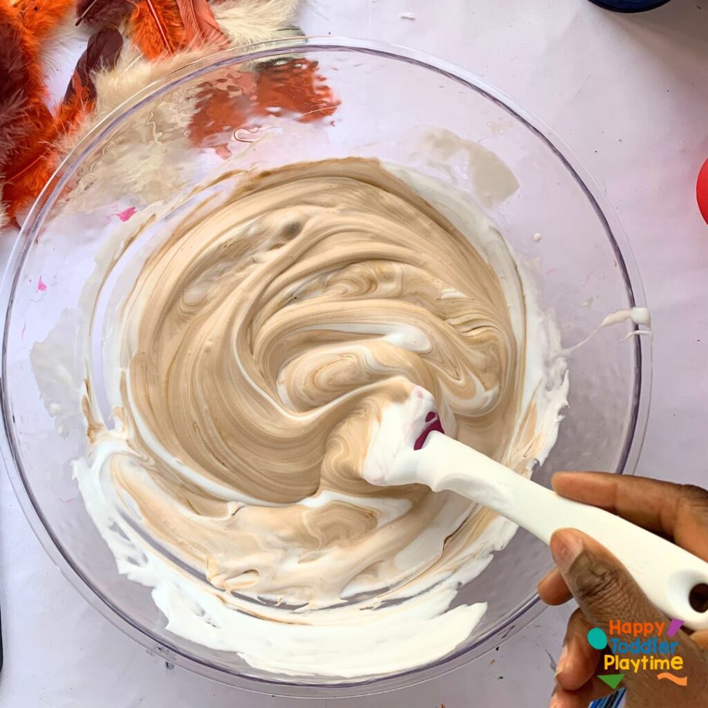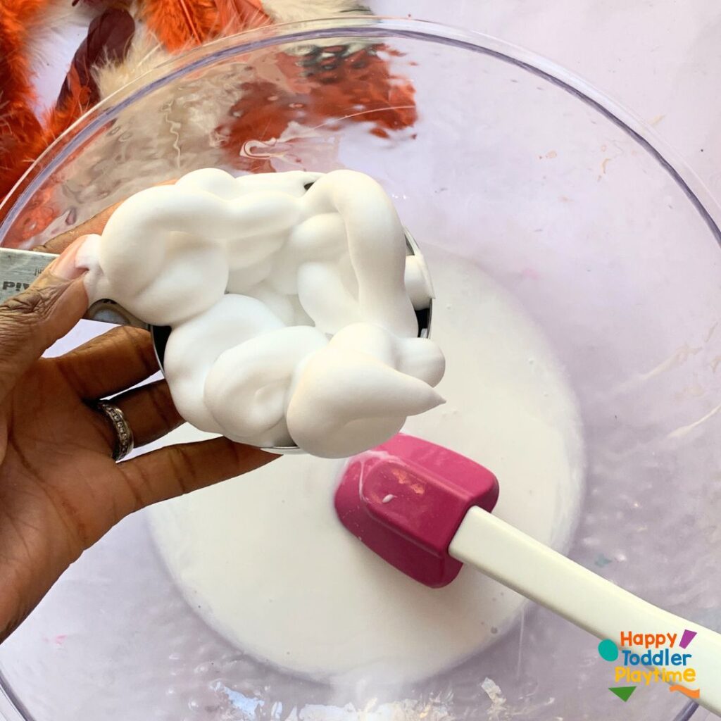 - Add shaving cream: Gradually add 1-2 cups of shaving cream, depending on the texture you prefer. More shaving cream will make it fluffier, while less will keep it slimier. We usually go for about 1 1/2 cups. Stir well for a few minutes until it becomes thick and difficult to mix.