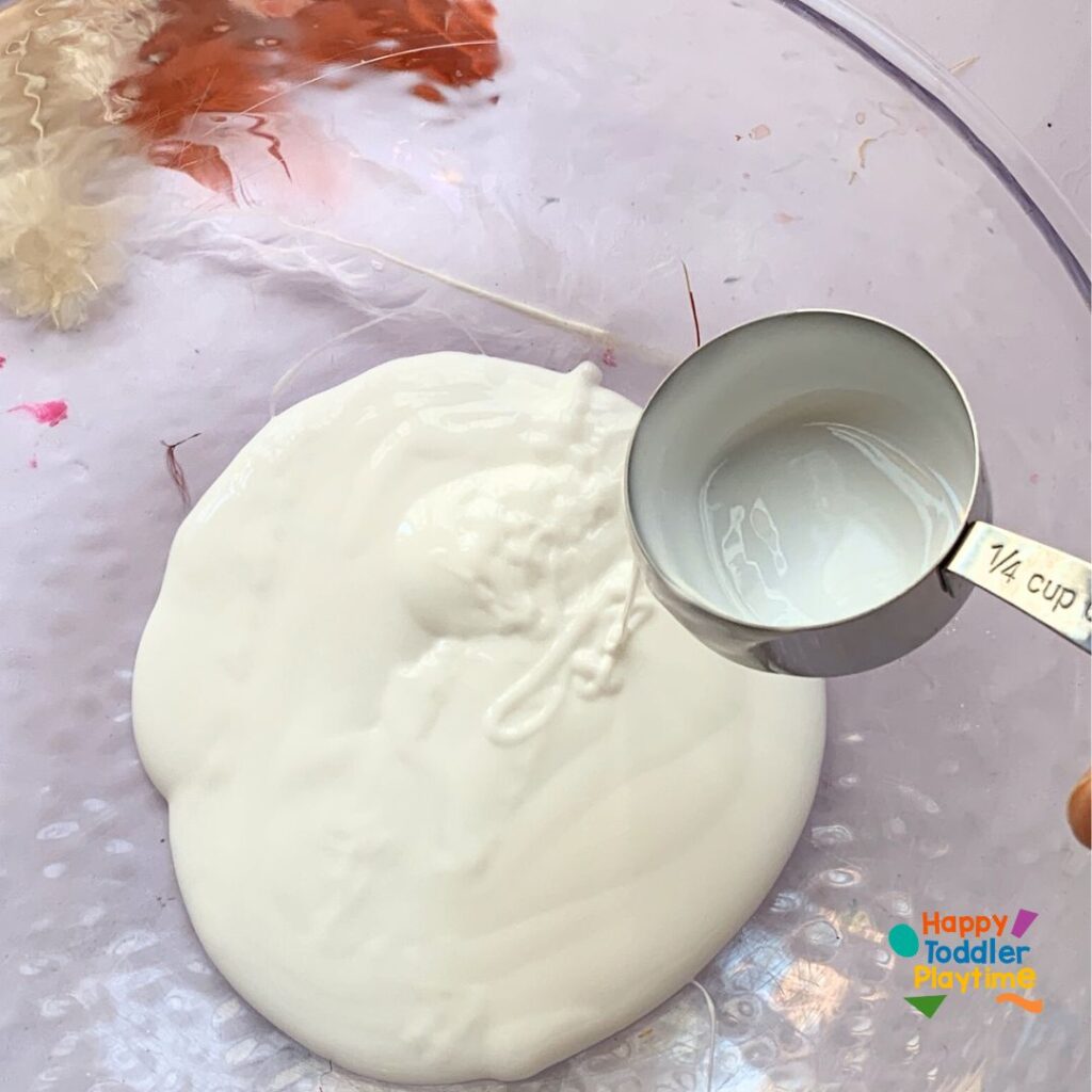 The saline solution is the key “activator” in this recipe, meaning it’s the ingredient that helps turn the glue mixture into stretchy, fun slime! To make sure it works, check that your saline solution contains either sodium borate or boric acid, as these ingredients are what help the slime form properly.