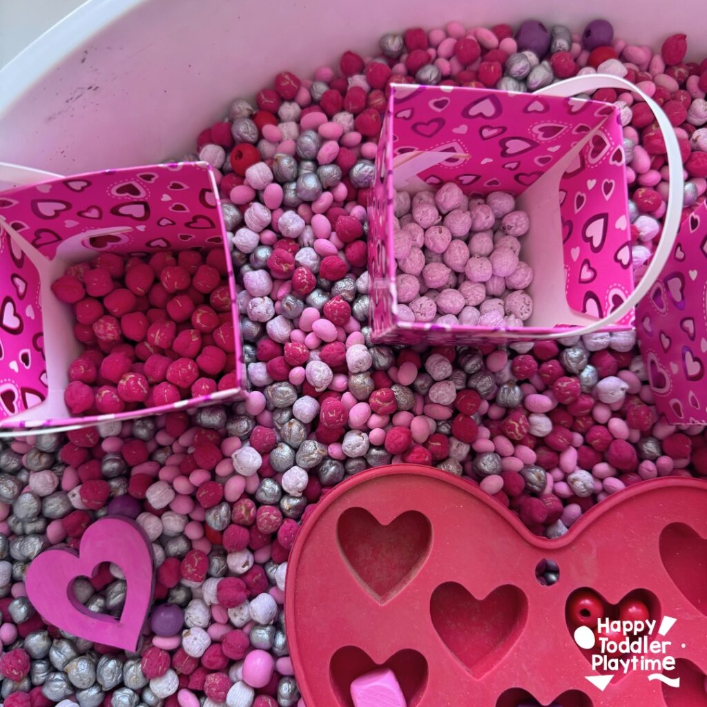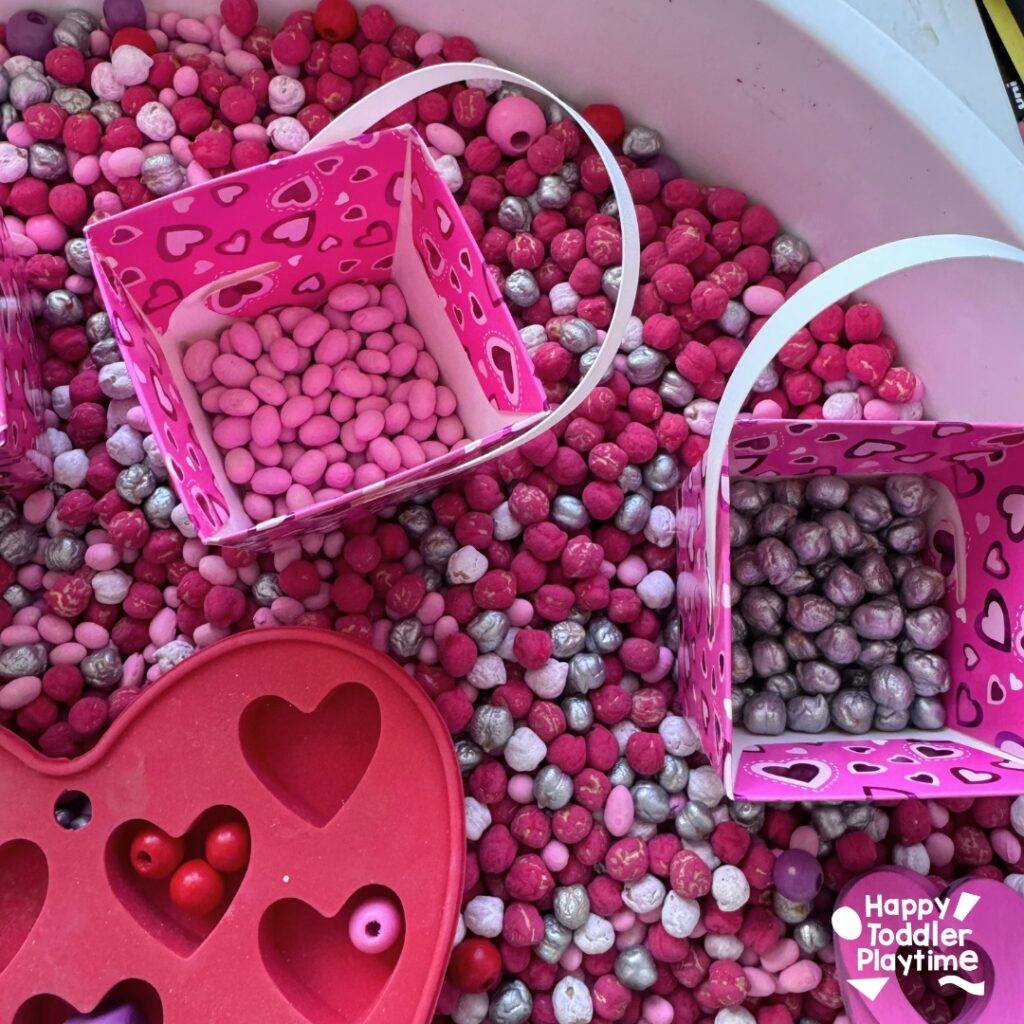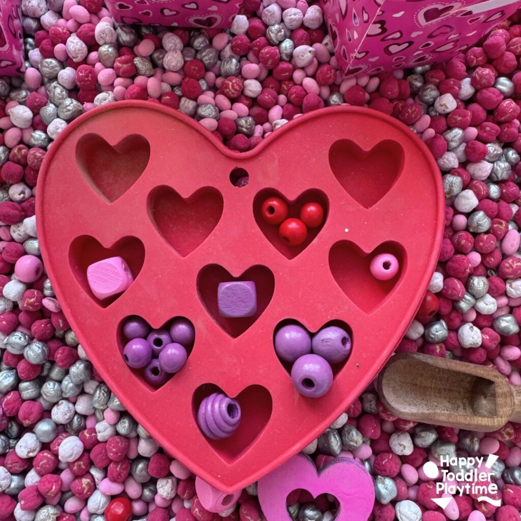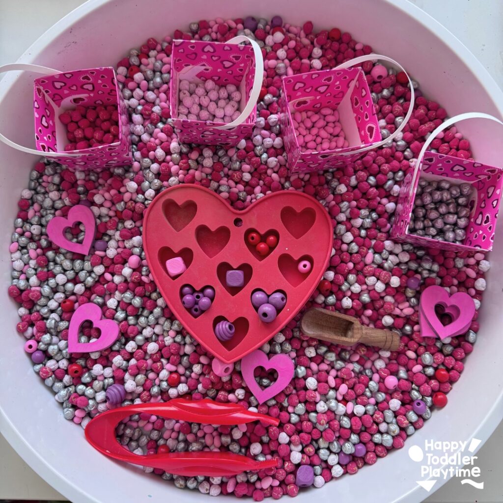 Fill the bin with dyed chickpeas, pink beans, and red and pink beads. Add heart-shaped scoops, measuring cups, and silicone cupcake liners to encourage interactive play. If you don’t have silicone cupcake liner just use regular ones or head out to the dollar store and grab little Valentine’s themed boxes like we used!