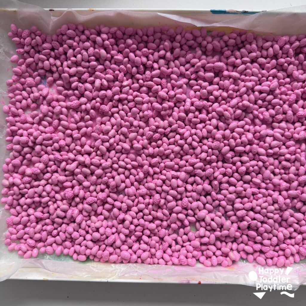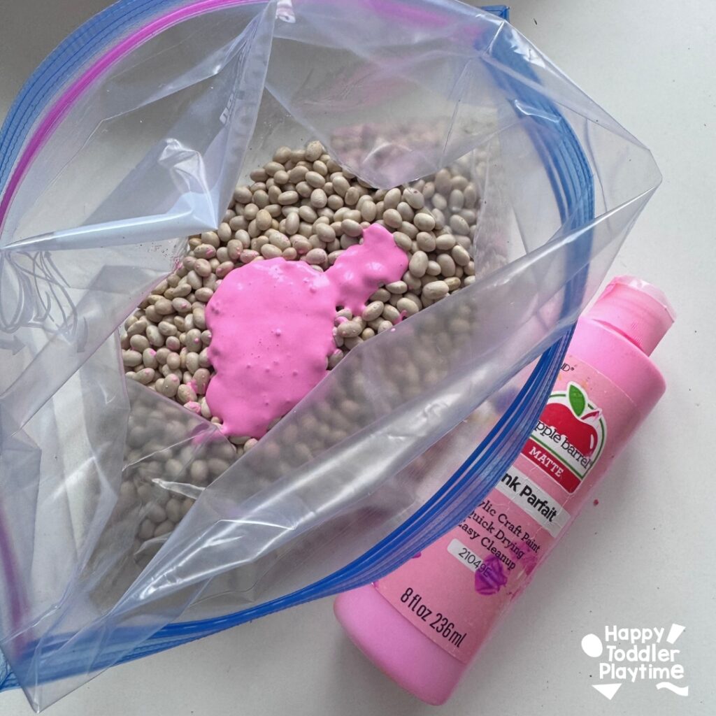 Place dry 2 cups of dried chickpeas in a ziplock bag and add a few drops of red. Shake the bag until the chickpeas are evenly coated, then spread them on parchment paper to dry. Once fully dry, they’re ready to be used in the sensory bin! Repeat with silver or white acrylic paint. And then repeat with white beans with pink paint.