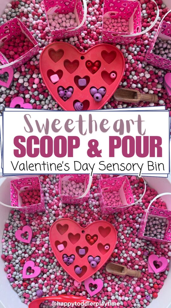 Check out this Sweetheart Scoop & Sort Sensory Bin as a fun and easy way to keep your little one busy this Valentine’s. It’s hands-on sensory fun and a great way for toddlers and preschooler to explore textures, colors, and sorting skills while celebrating the holiday. With dyed chickpeas, pink beans, and heart-shaped tools, your little ones will love scooping, pouring, and sorting as they play.