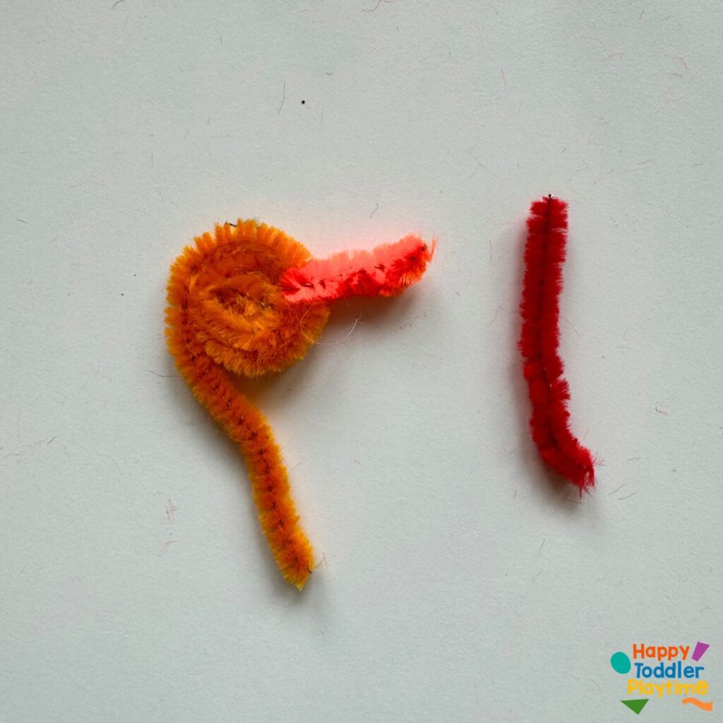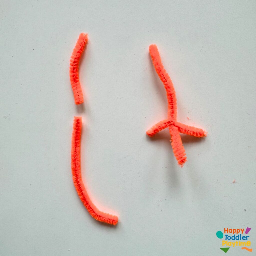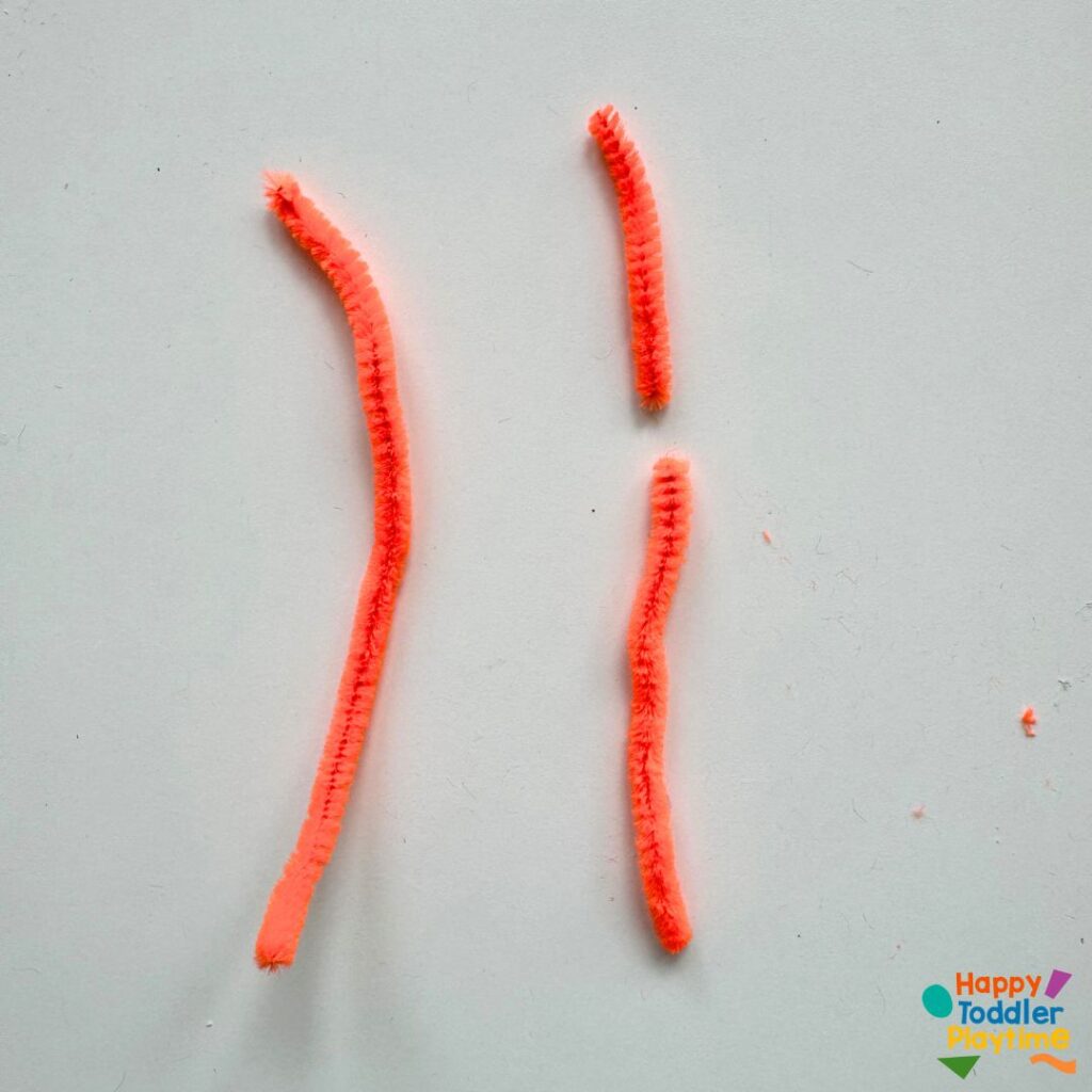- Cut an orange pipe cleaner in half, then cut each half down to about 1/3 of its original length.