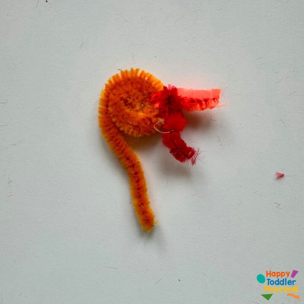 - Wrap a short piece of red pipe cleaner around the orange one to form the snood.