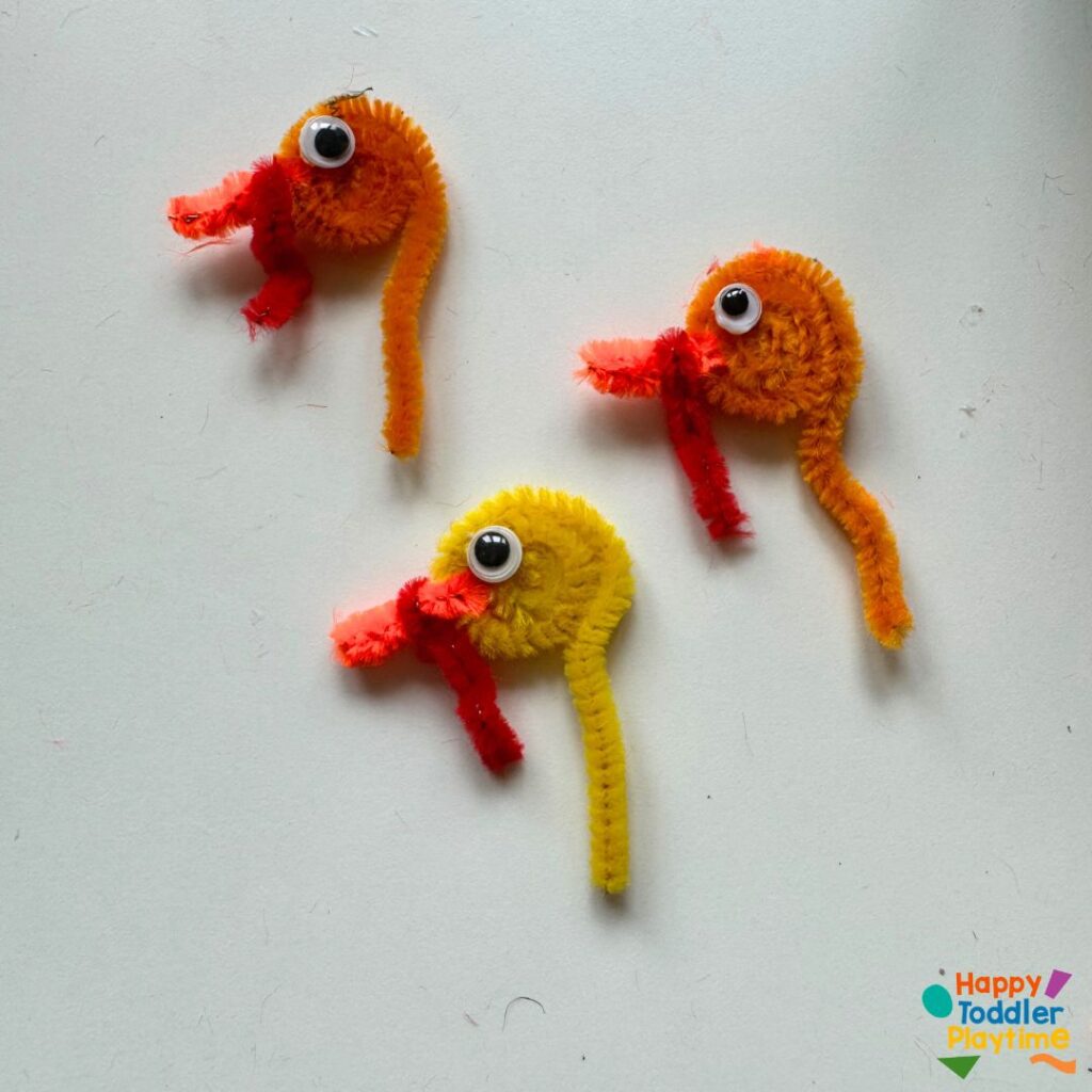 - Start by cutting tan and brown pipe cleaners in half. Take one end of each half and roll it tightly to form a small, flat circle for the turkey’s head, leaving about 2 inches for the neck.