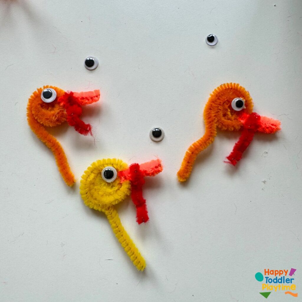 - Cut a 2-inch piece of orange pipe cleaner, thread it through the circle, and twist to create the beak.