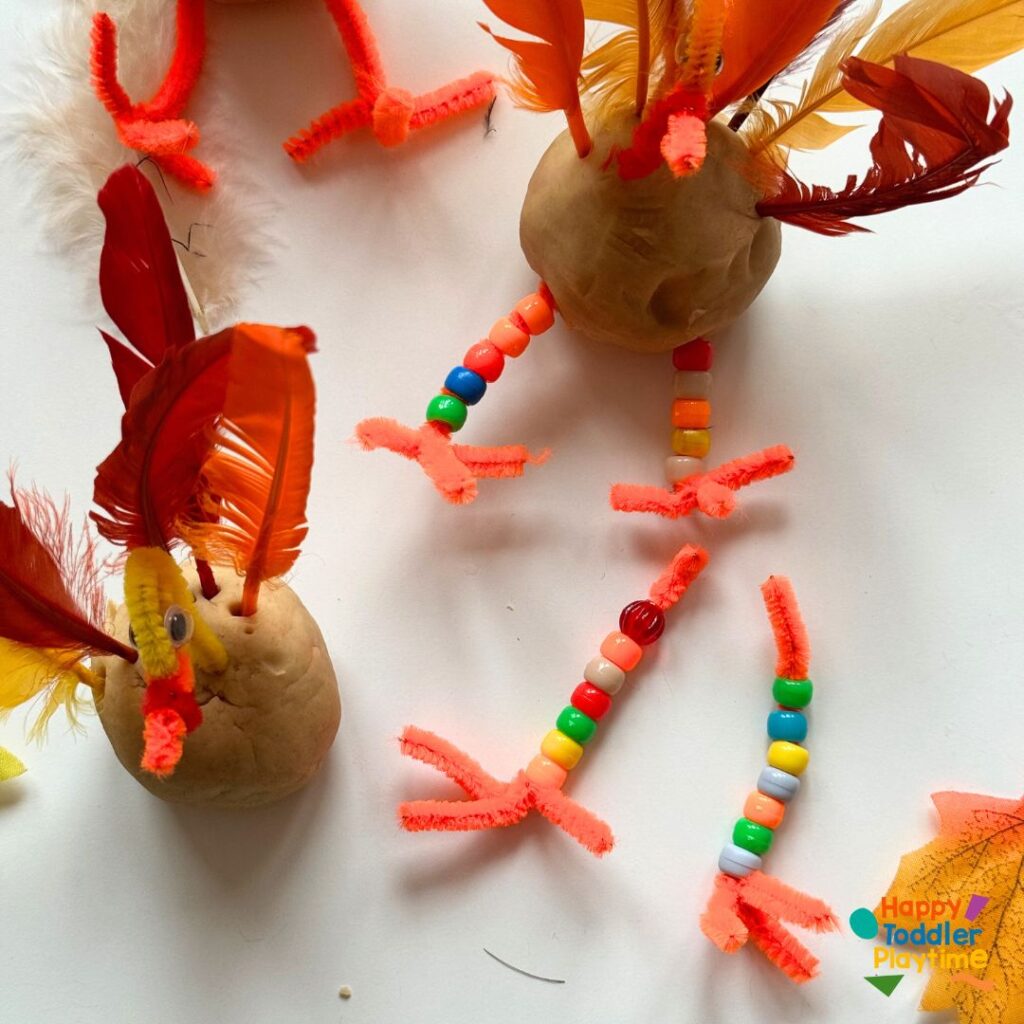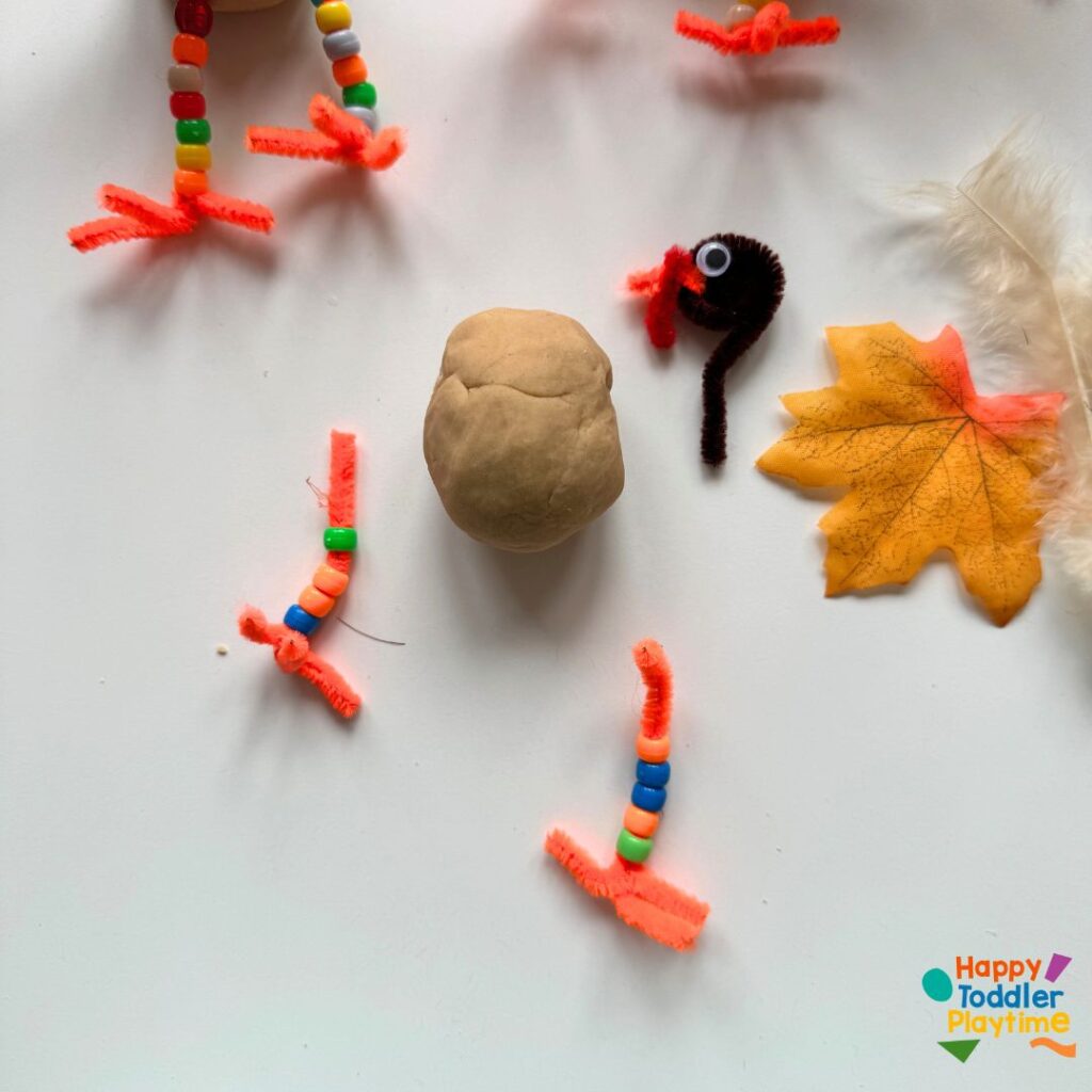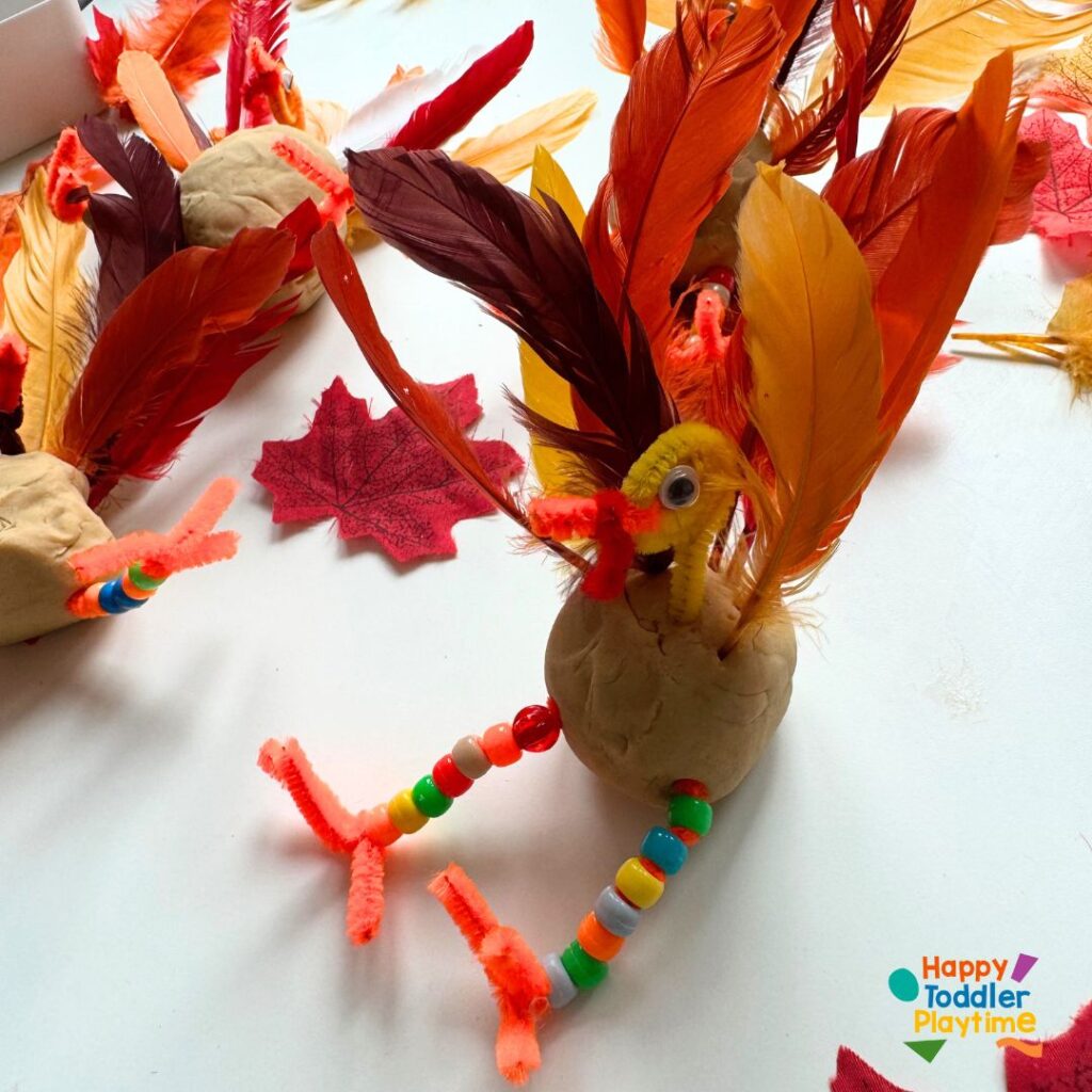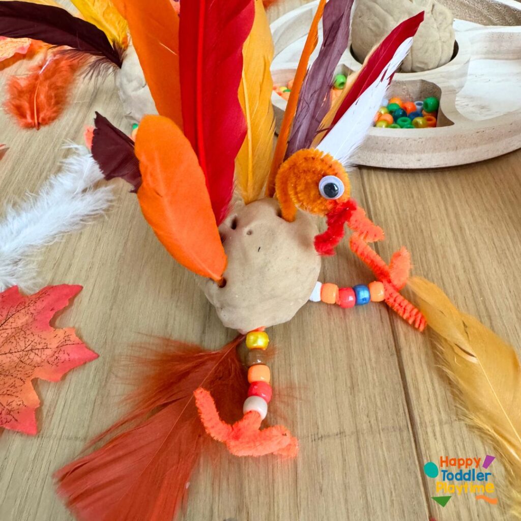 - Invite your child to make their turkey by forming a playdough ball, inserting the legs with beads, placing the head on top, and decorating with feathers in the back.