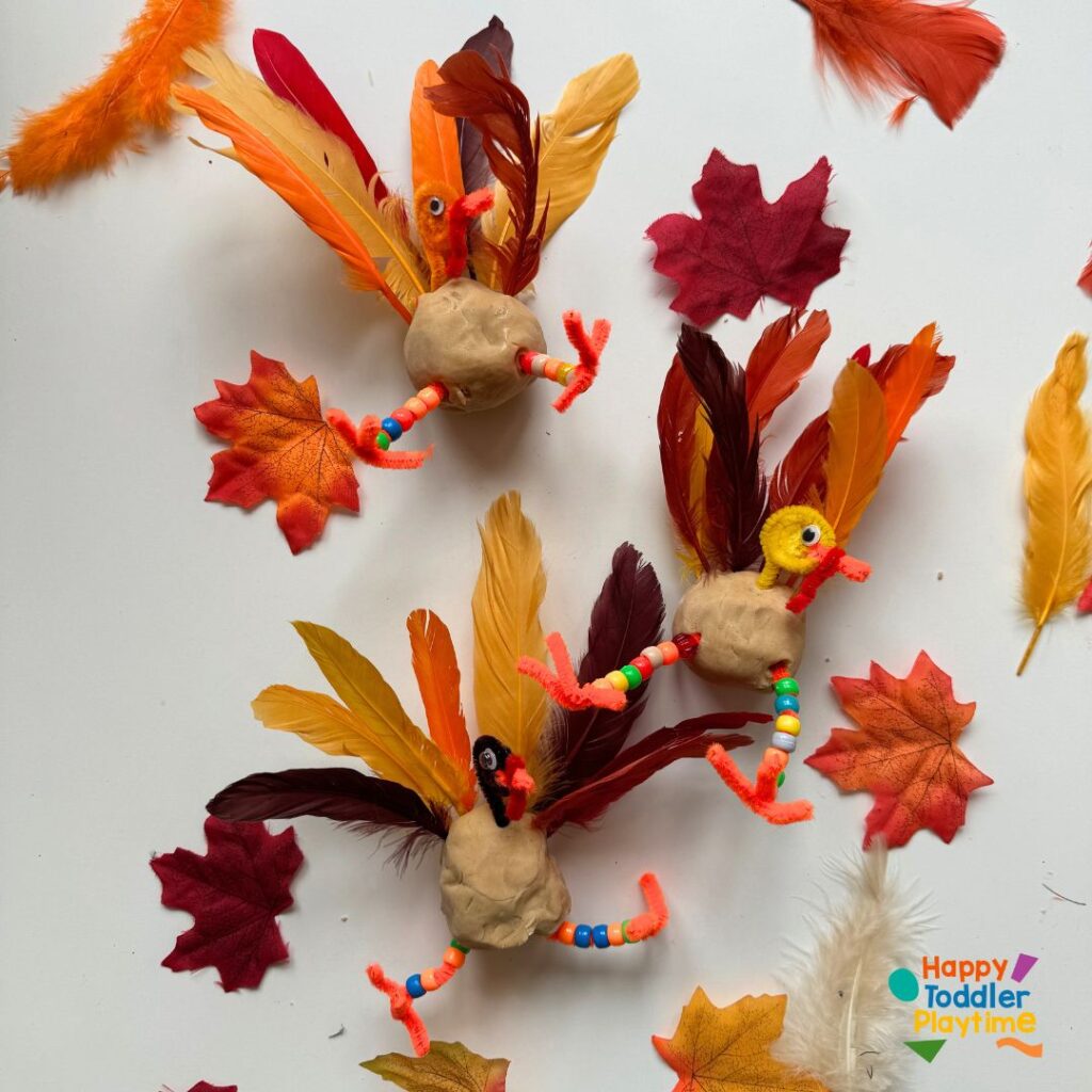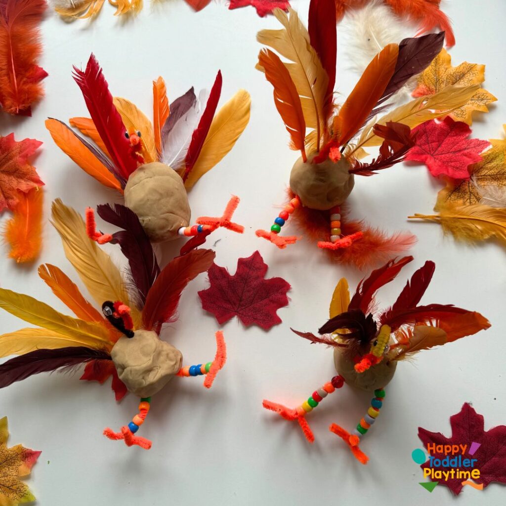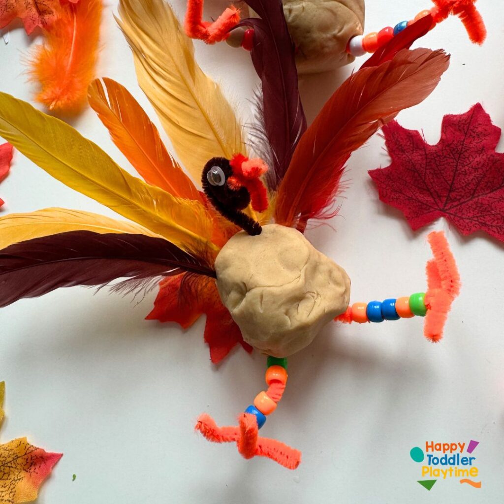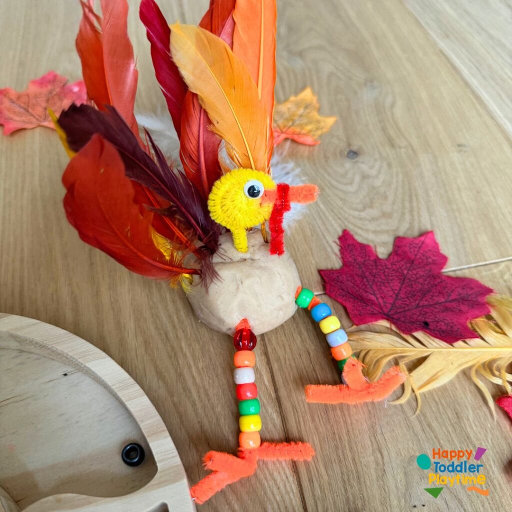 - Invite your child to make their turkey by forming a playdough ball, inserting the legs with beads, placing the head on top, and decorating with feathers in the back.