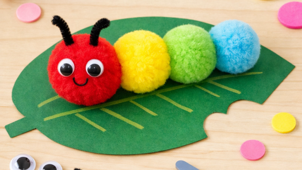 - Nose and Mouth: Glue on a small Pom Pom just below the eye for the nose. You can also draw a line for a smiling mouth.