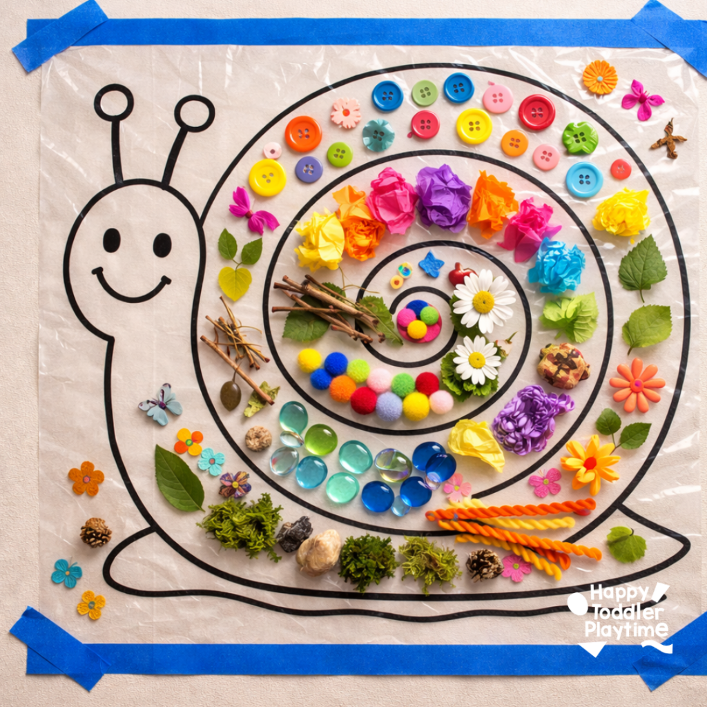 - I like to use an appetizer tray when doing activities like this that need multiple different art supplies. Give your little one lots of different items to stick up on their snail including buttons, feathers, tissue paper, foam shapes.