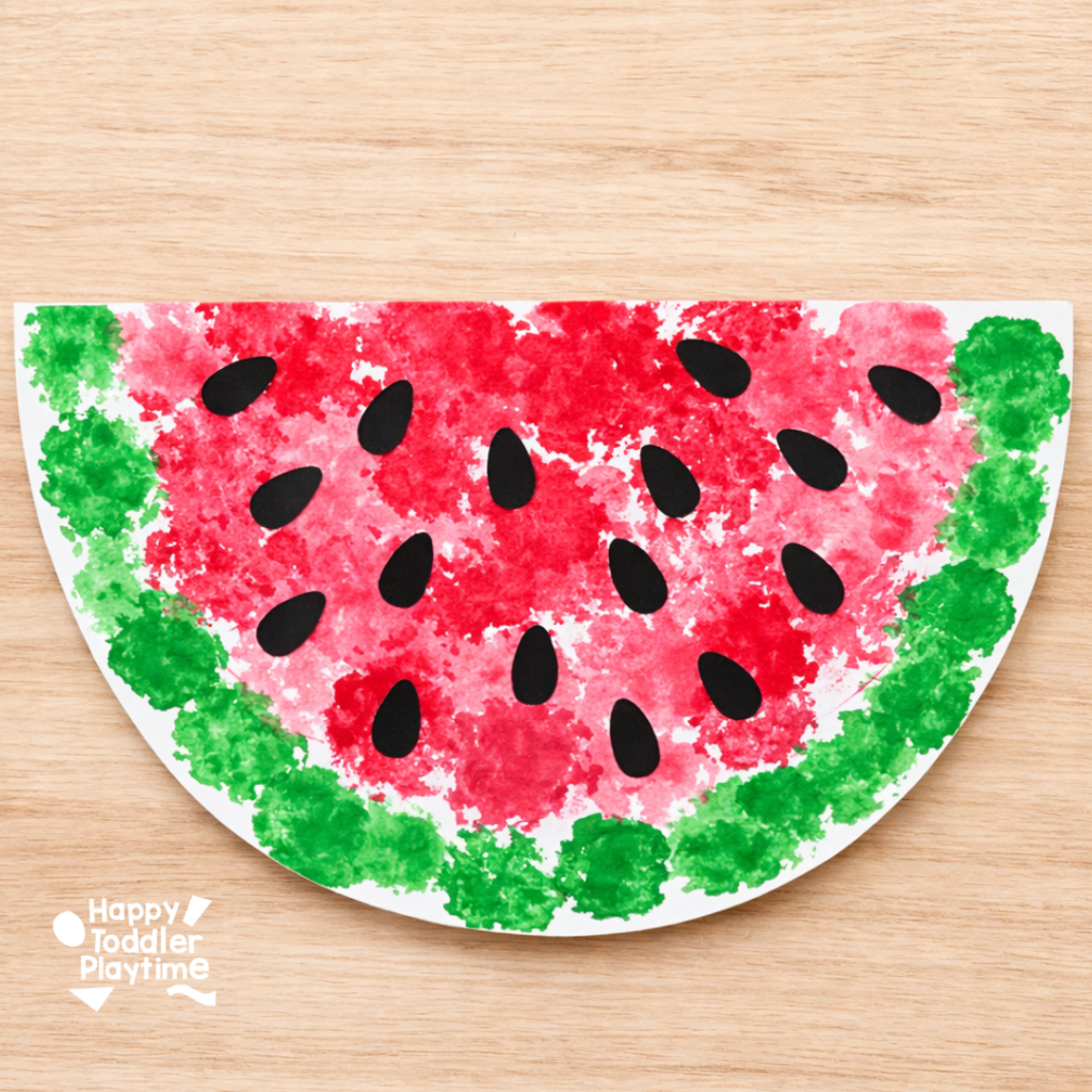 - Attach a clothes pin to a black pom pom and dip it into the black paint and dad it all over the watermelon to create the watermelon seeds.