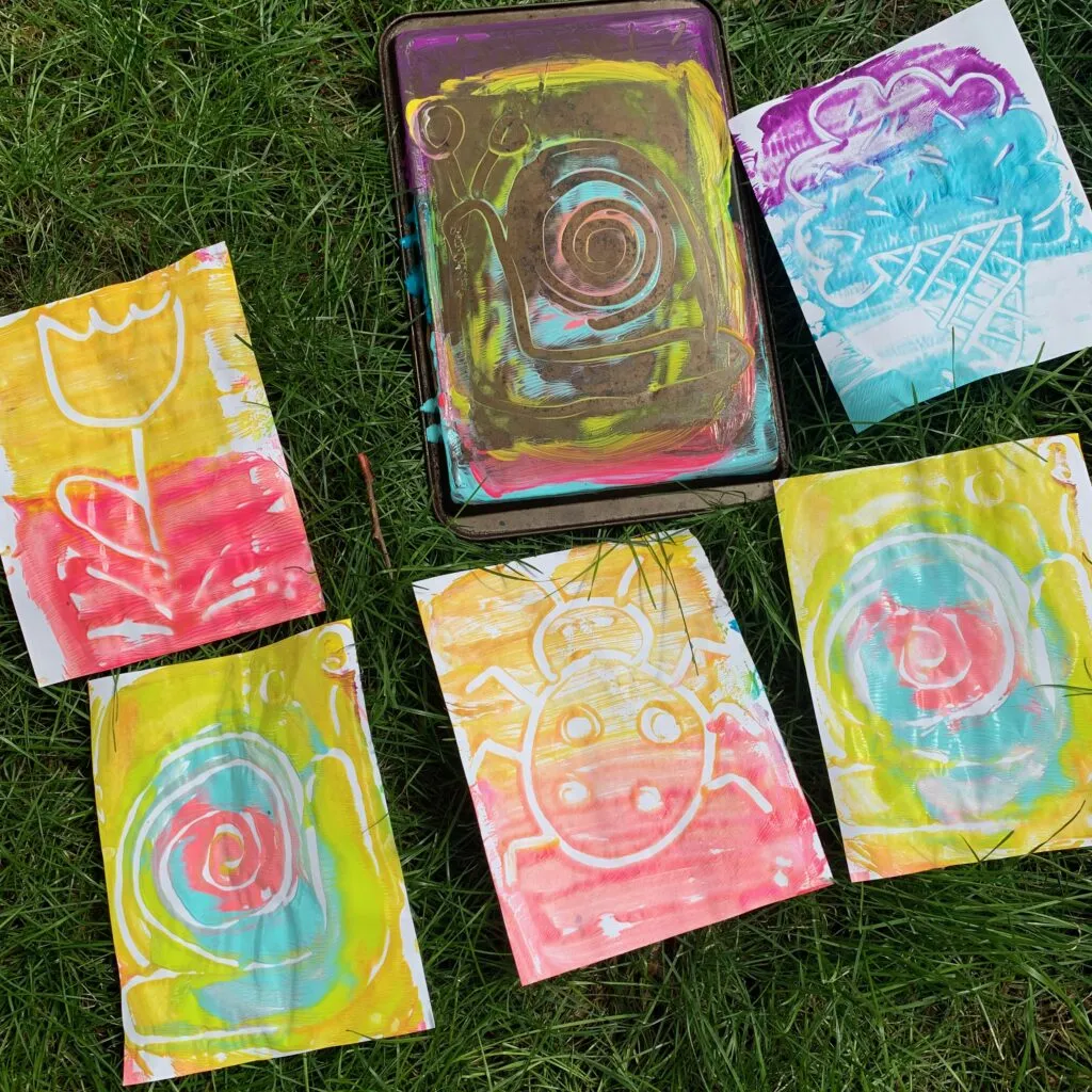 - Carefully peel the white paper back, the imprints of their colorful drawings will be revealed, just like magic! Each print will be a unique masterpiece, showcasing their creativity and artistic flair. Be sure to create more than one imprint with each painted baking sheet.