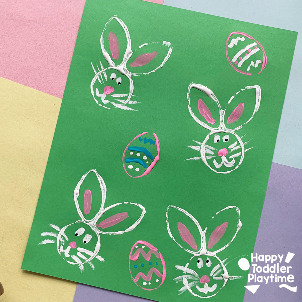 - Place white paint on a paper plate. Dip the bunny stamp into the white paint and then stamp it onto a sheet of paper.